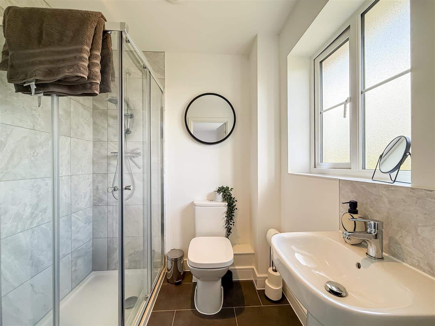En-suite Walk in shower cubicle, pedestal hand wash basin, close coupled w/c, tiled flooring and part tiled walls. Down light, expel air, radiator and a obscure double glazed window to the front.