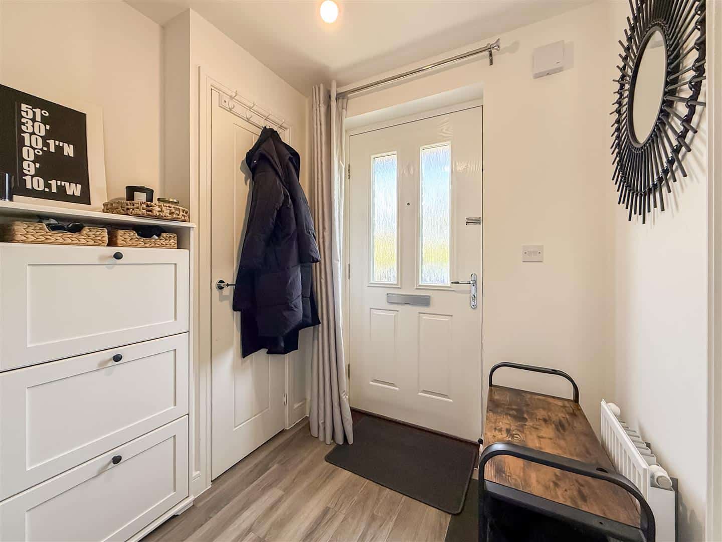 Entrance door to the hallway which has quality laid grey wood effect flooring, radiator, built in storage cupboard and stairs to the first floor.