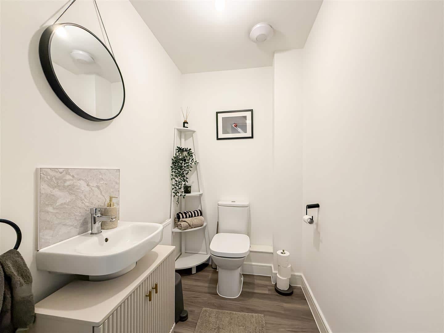 The cloakroom has a continuation of the grey wood effect flooring, close coupled w/c, free standing hand wash basin with vanity cupboards below, radiator and expel air.