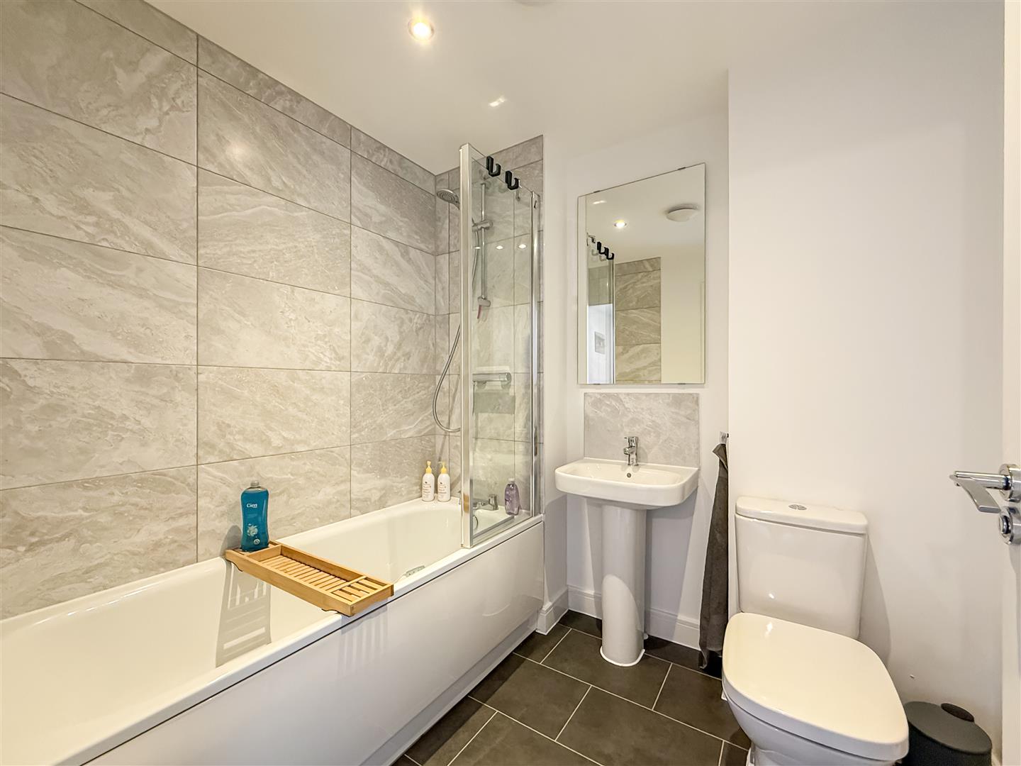 Part tiled walls and tiled flooring, panelled bath with taps and fitted shower/screen, pedestal hand wash basin, close coupled w/c, expel air and radiator.