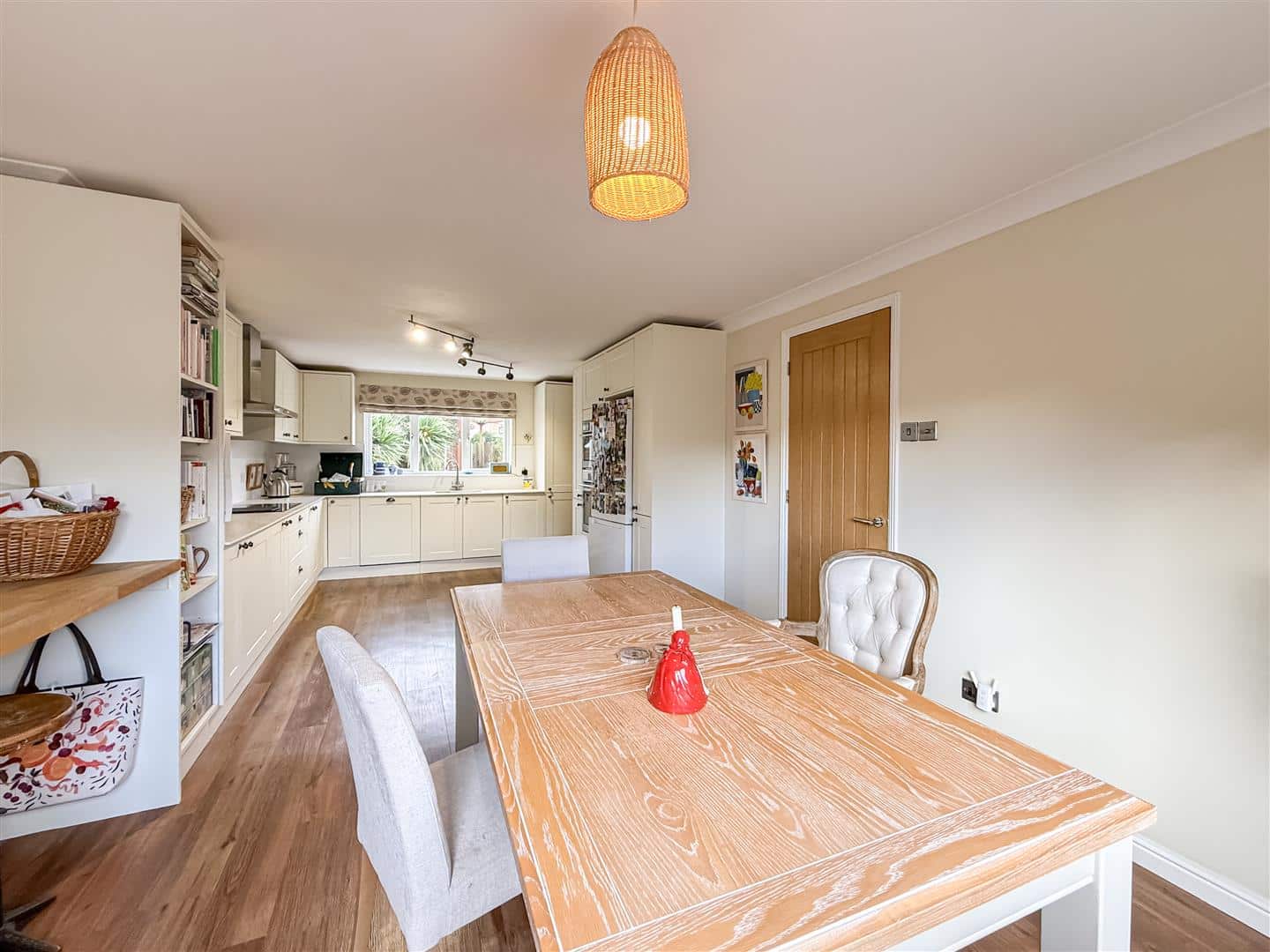 This is an excellent size room and certainly the hub of the home, with an extensive range of white Shaker style eye level units, matching base units incorporating a pull out larder with quality composite work tops. Inset stainless steel sink, integral dish washer, inset induction hob with above stainless steel extractor and glass splash back, built in AEG micro wave oven and AEG fan oven, recess for fridge/freezer. The units do extend along with matching shelving to one wall in the dining room, with a solid oak top breakfast bar. Wood effect flooring running the length of the room, double glazed window to the rear and door to the utility room.