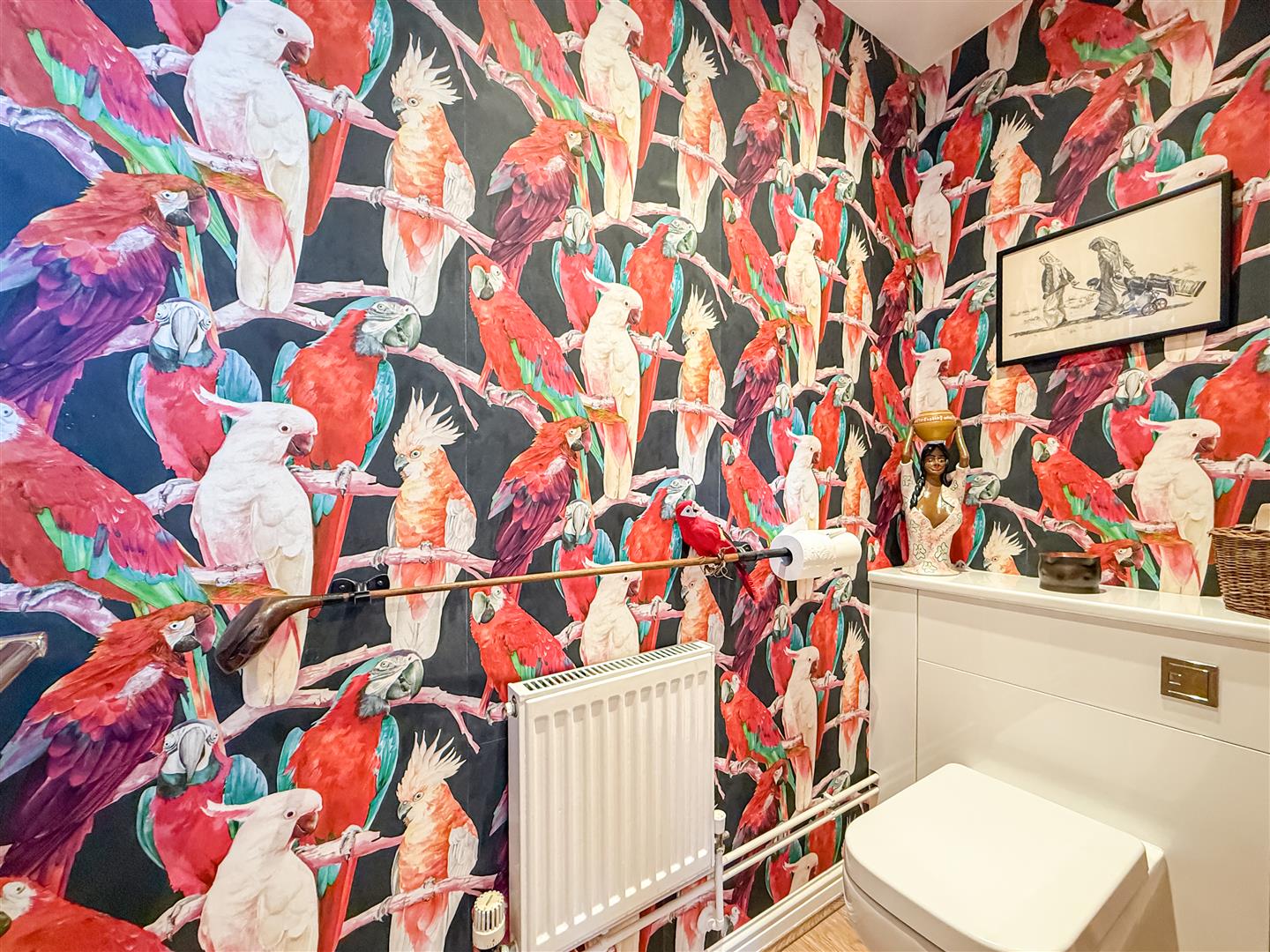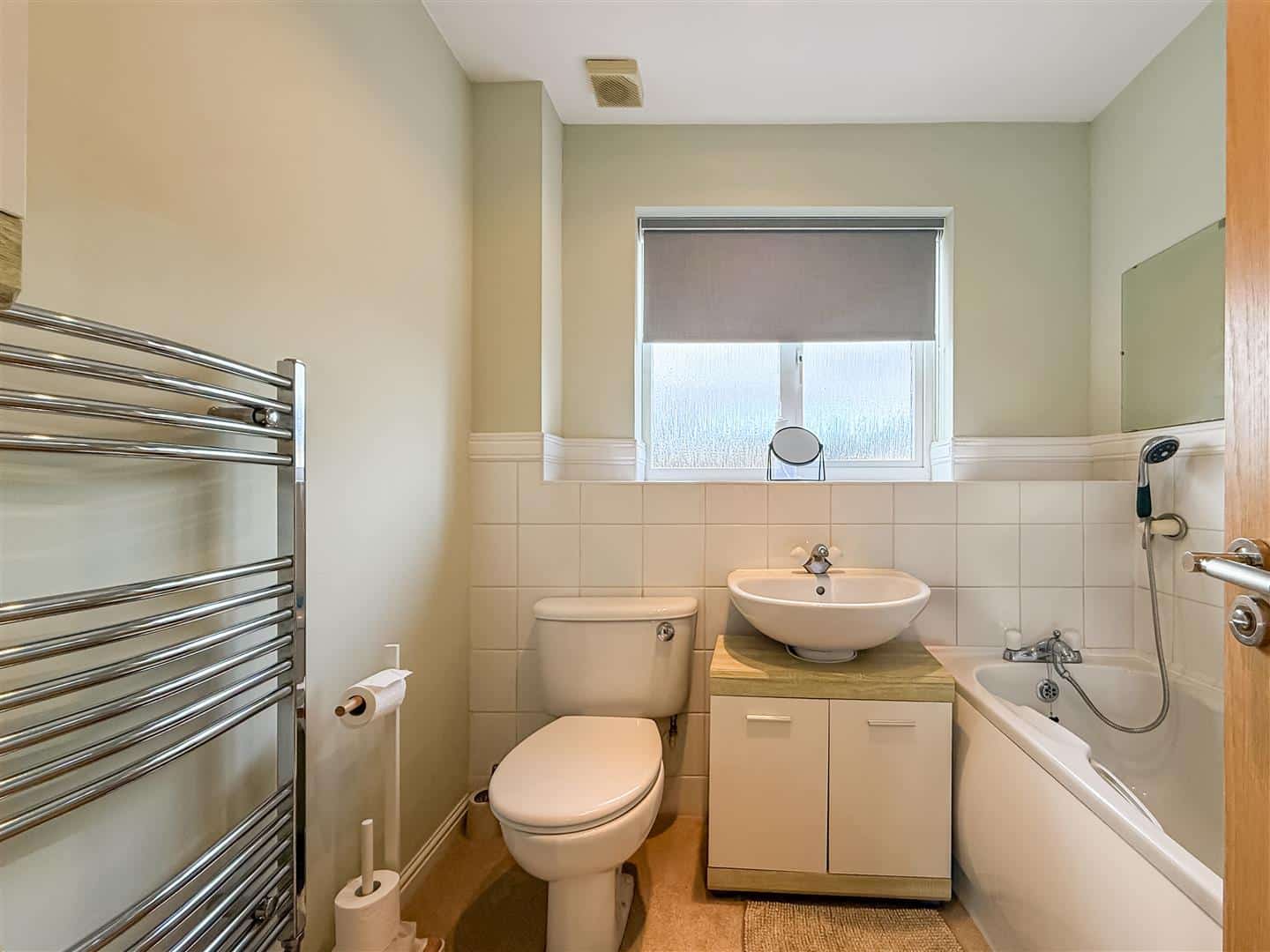 Part tiled walls, panelled bath with taps/shower attachment, hand wash basin with vanity cupboards below, close coupled w/c. Chrome heated towel rail, shaver point, expel air and double glazed window to the rear.