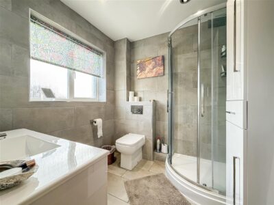 En-suite Tiled flooring and walls, walk in corner shower cubicle, hand wash basin with vanity drawers below, w/c with built in cistern and surround. Down lighting, expel air, shaver point and double glazed window to the front.