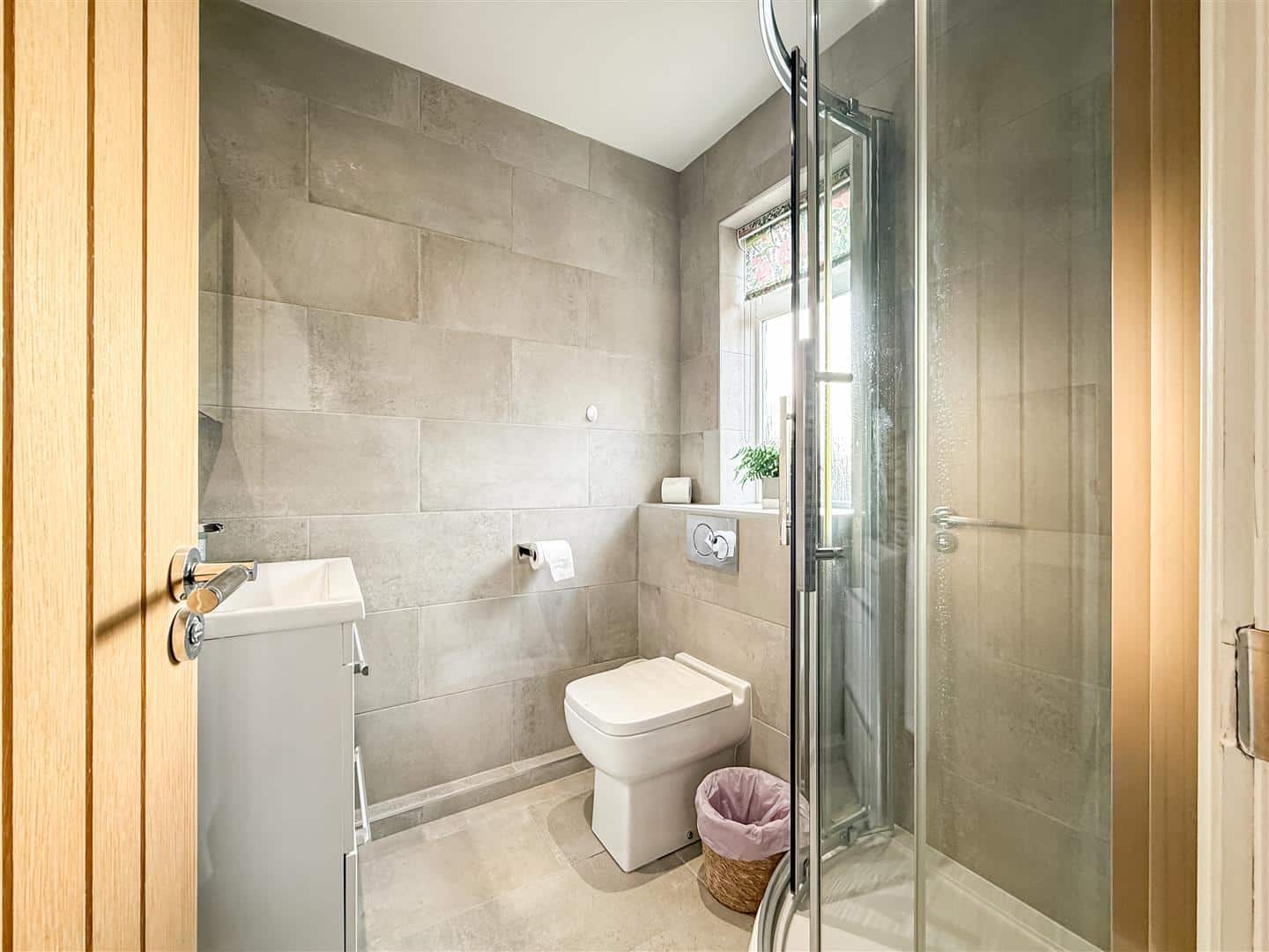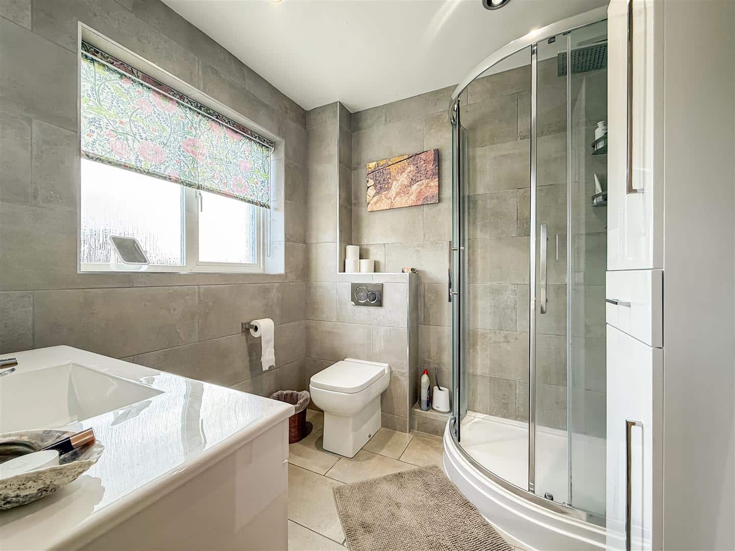 En-suite Walk in corner shower cubicle, hand wash basin with vanity drawers below, w/c with built in cistern and surround. Tiled flooring and walls, down lighting, expel air, chrome heated towel rail and a double glazed window to the front.