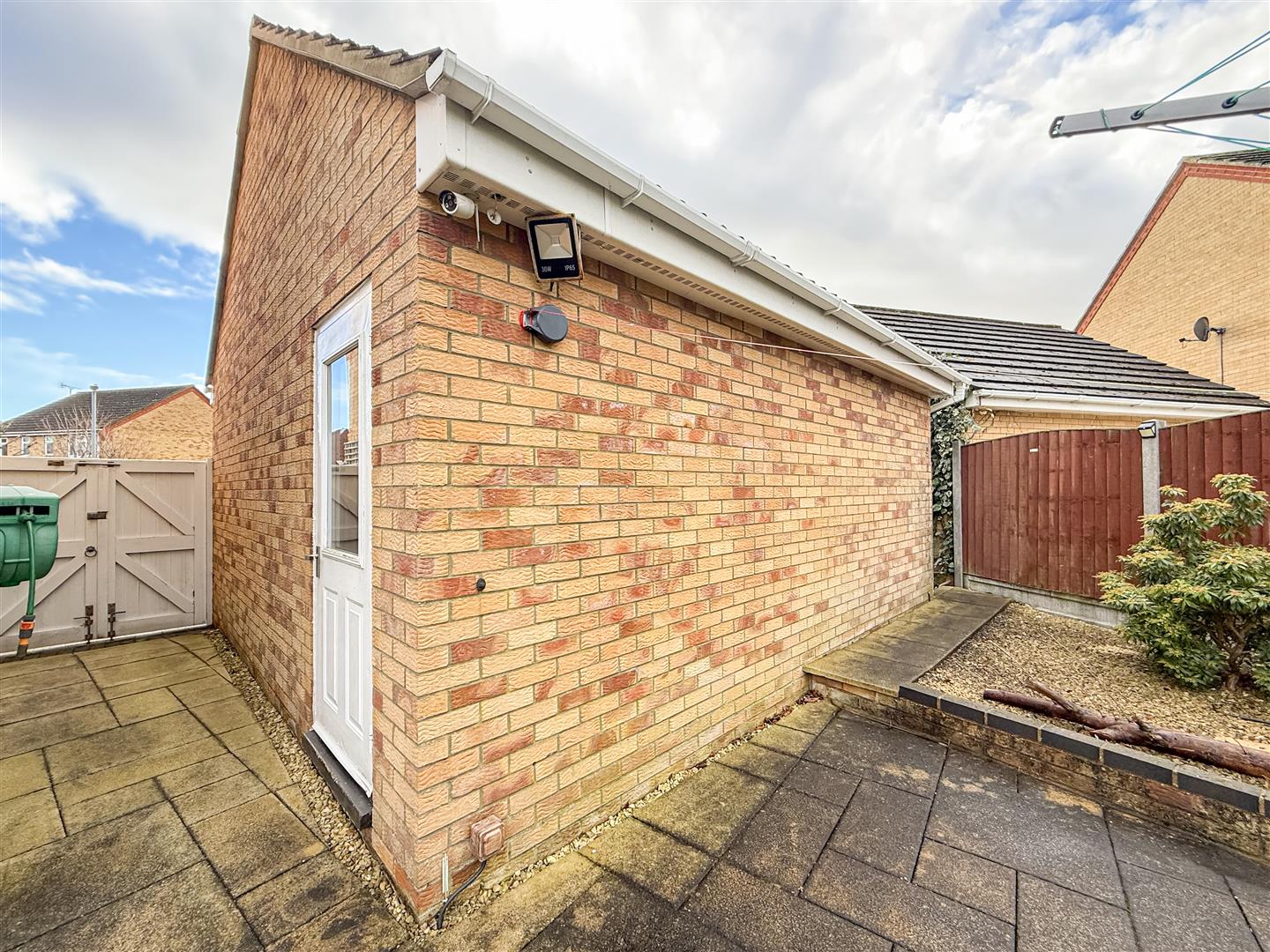 The property has a good size frontage due to its favourable corner plot, the drive has parking 3/4 vehicles with to one side a gate and storage area. The double garage is detached with dual up and over doors, power and light. The remaining frontage has borders with some planting and part lawn.