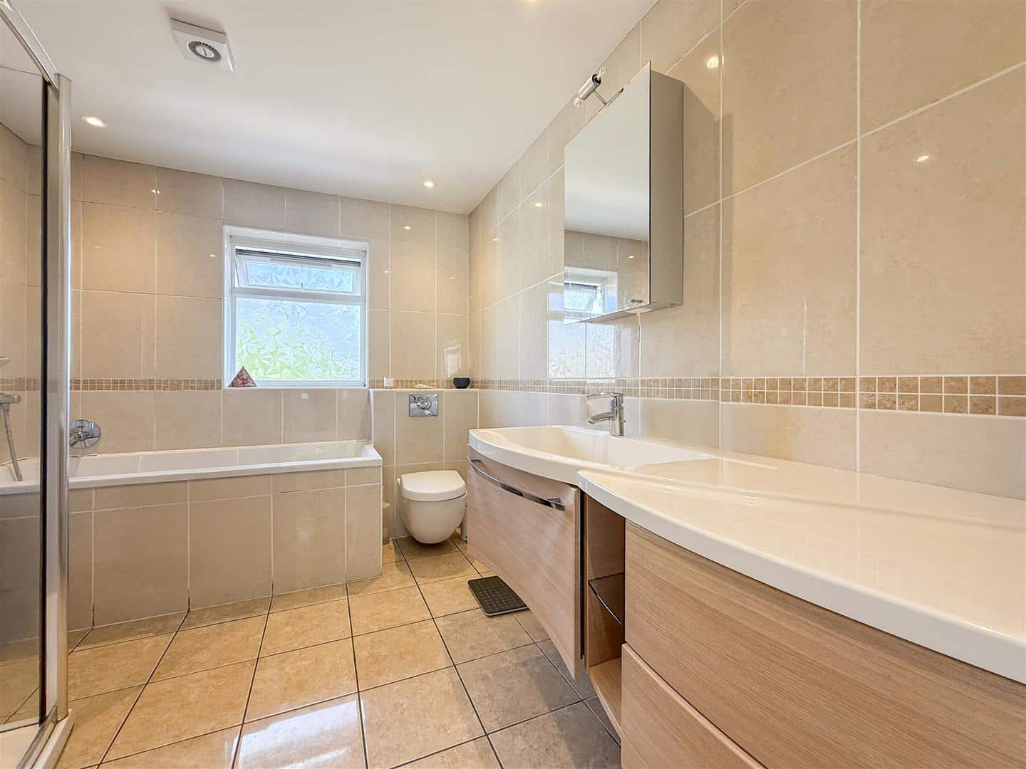 Tiled flooring and walls, panelled bath with taps/shower attachment, hand wash basin with vanity surround and drawers below. Walk in shower cubicle with rain and hand held showers, w/c with built in cistern, down lighting, expel air, chrome towel rail and a double glazed window to the rear.