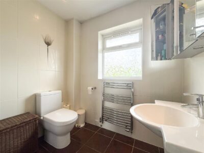 Tiled flooring and walls, walk in shower cubicle, hand wash basin, close coupled w/c and down lighting. Expel air, chrome heated towel rail and a double glazed window to the rear.