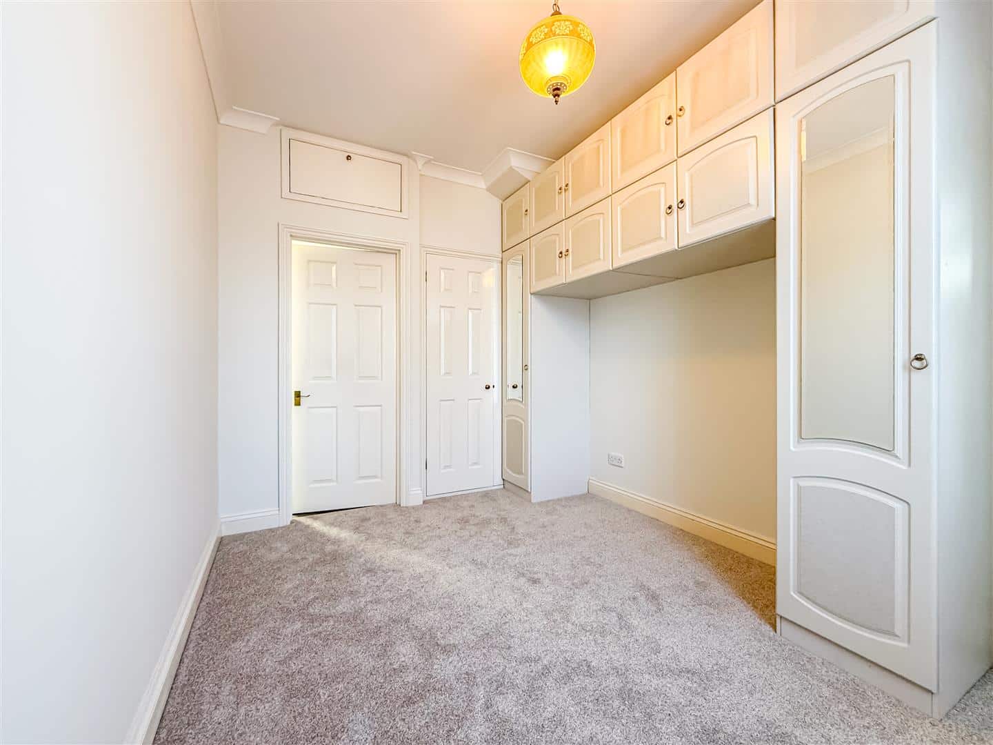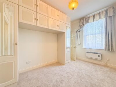 A good size double bedroom with two single fitted wardrobes and above bridging cupboards, built in cupboard/wardrobe. Wall mounted electric heater and a double glazed window to the side.