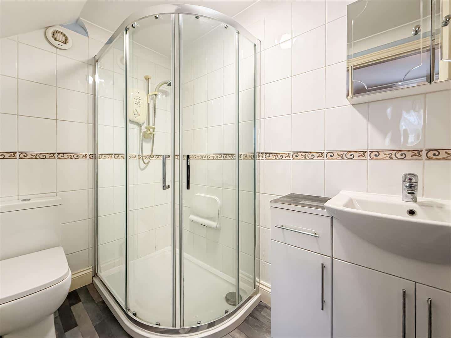 En-suite walk in shower cubicle, close coupled w/c, hand wash basin with vanity cupboards below. Majority tiled walls, heated towel rail and a built in double cupboard.