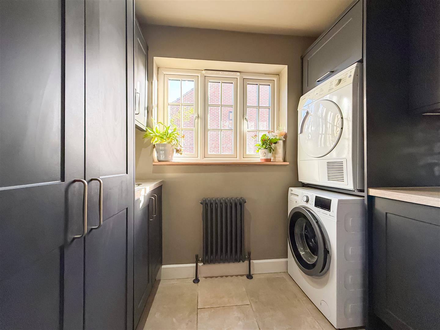 The utility has matching coloured units to the kitchen, eye level units, base units and a double 3/4 length units, wood effect work surfaces and an inset stainless steel sink. The tiled flooring continues from the kitchen and there is plumbing for washing machine and tumble dryer. Down lighting, column style grey radiator and a double glazed window to the side.