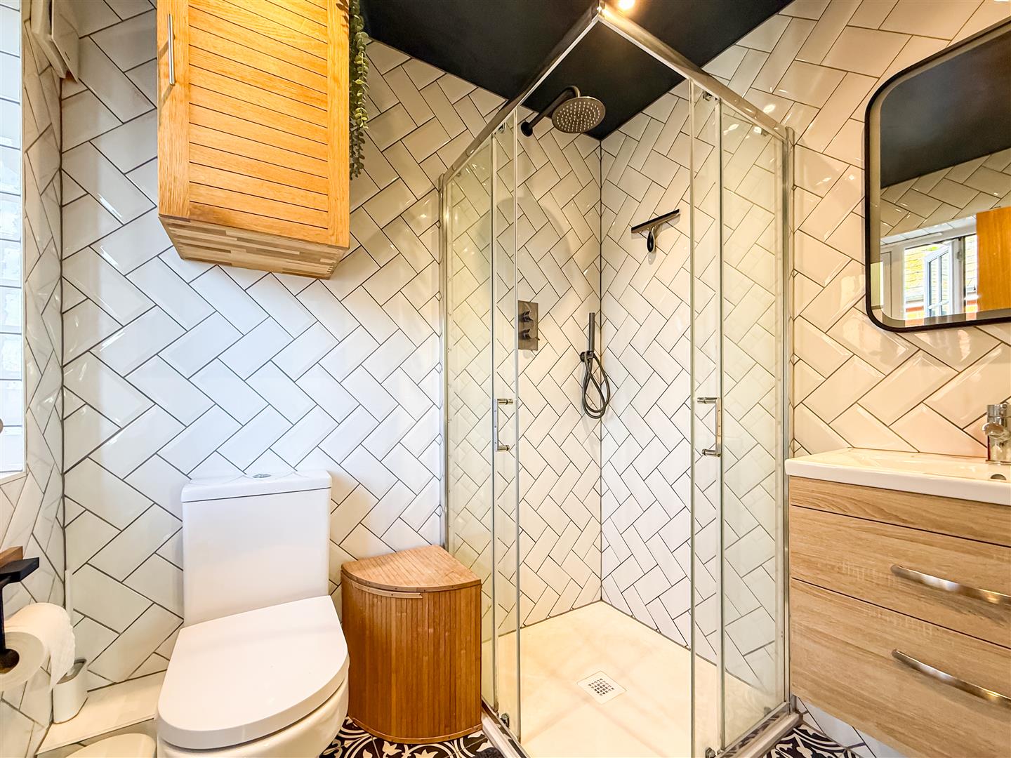 Tiled flooring and walls, w/c with built in cistern and vanity surround incorporating the hand wash basin, panelled shower bath/screen above rain and hand held showers. Down lighting, chrome heated towel rail, expel air and a double glazed window to the rear.