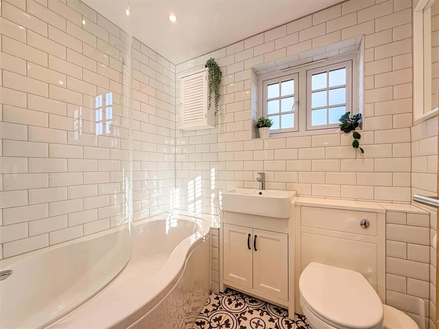 Half tiled walls, close coupled w/c, hand wash basin with vanity cupboard below, double glazed window to the side.