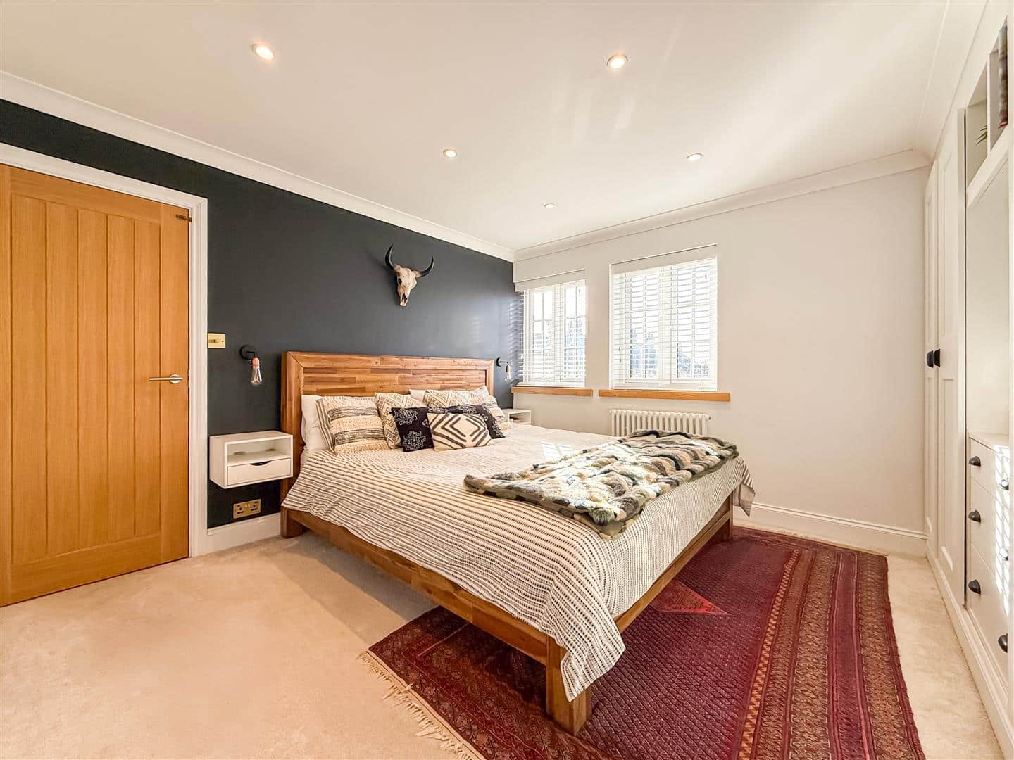 This generous size double room has two sets of fitted double wardrobes with a chest of drawers in between, shelving and space for a television. Dual double glazed windows with fitted blinds to the front, making this a nice bright and airy room. Down lighting, white column style radiator and a n oak panelled door to the en-suite.