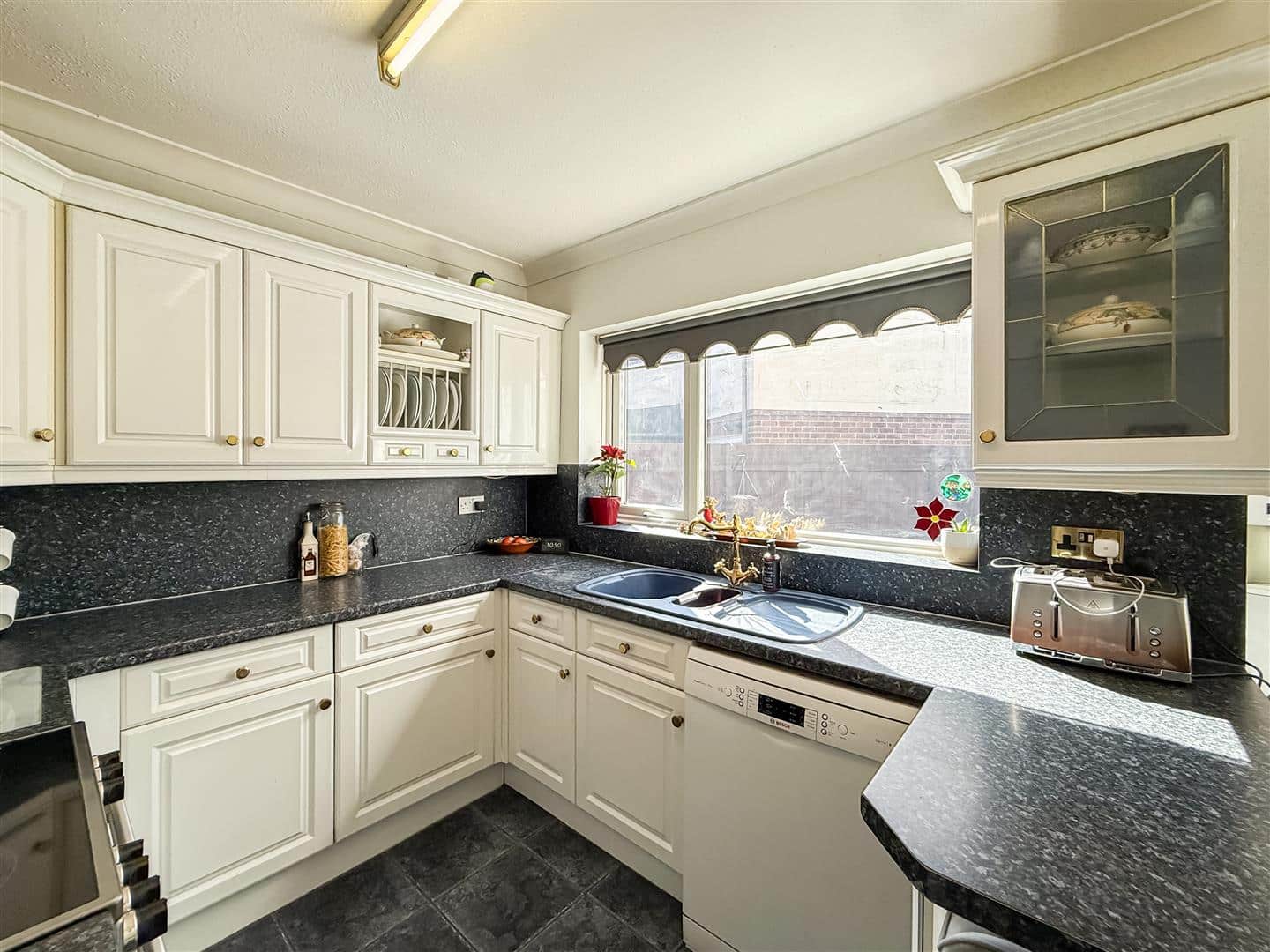 This room has a range of high white eye level units incorporating a plate rack with matching splash backs to the work surfaces. Matching base units and drawers with work surfaces over and a small matching breakfast bar. Inset one and a half sink, space for an electric oven with above extractor, plumbing for a dish washer, tiled flooring, radiator and a double glazed window to the side.