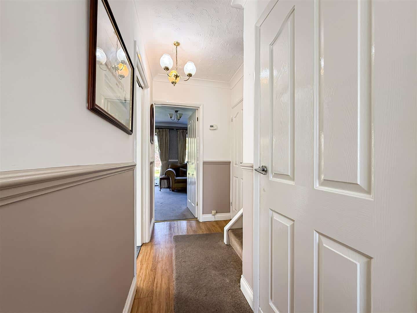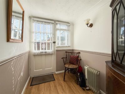 A good size entrance porch with door and side screen window, wood effect laminate flooring.