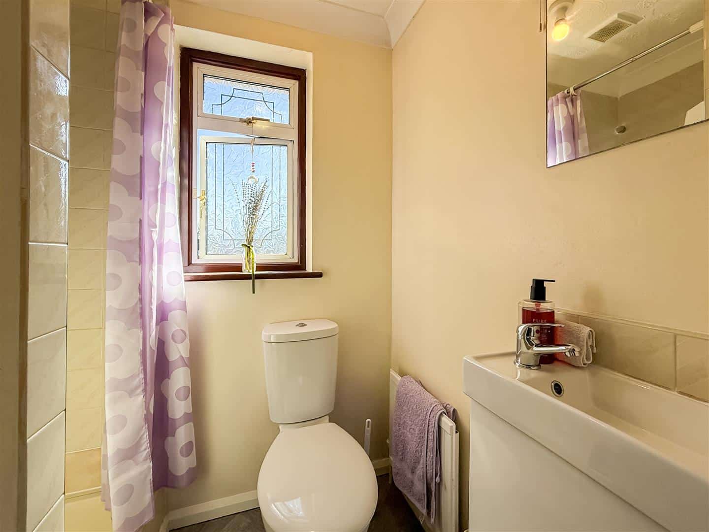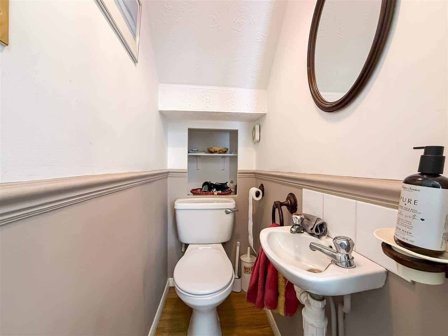 Wood effect laminate floor again continuing from the hallway, close coupled w/c, hand wash basin and inset shelving/storage space.