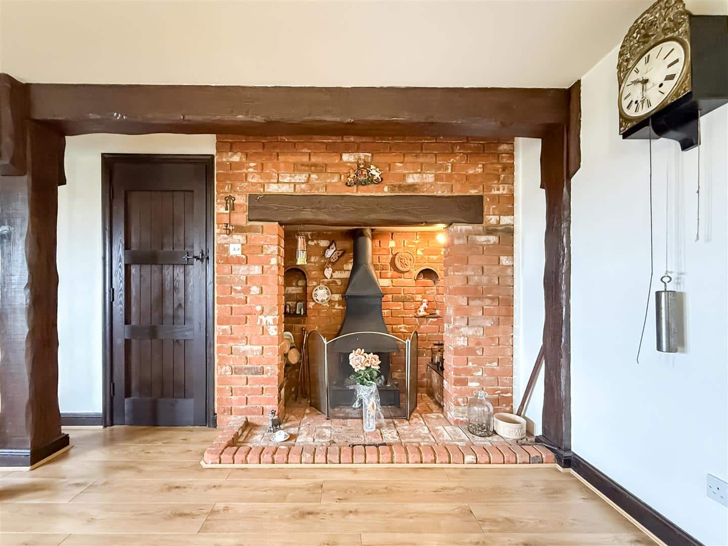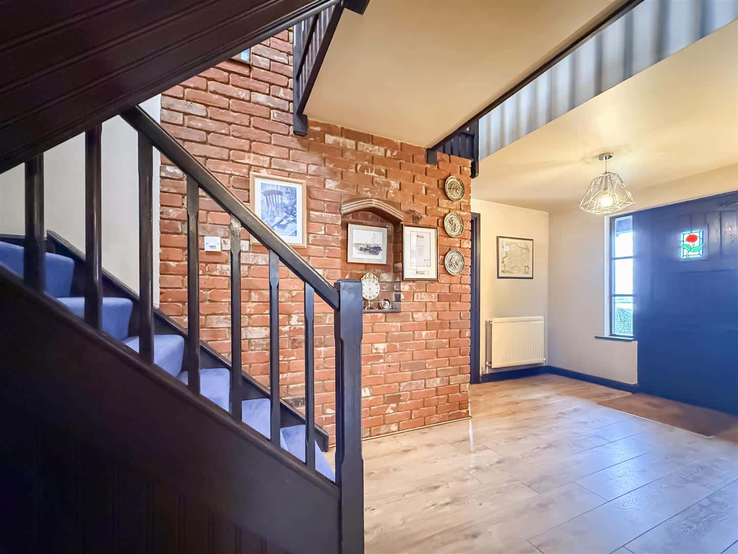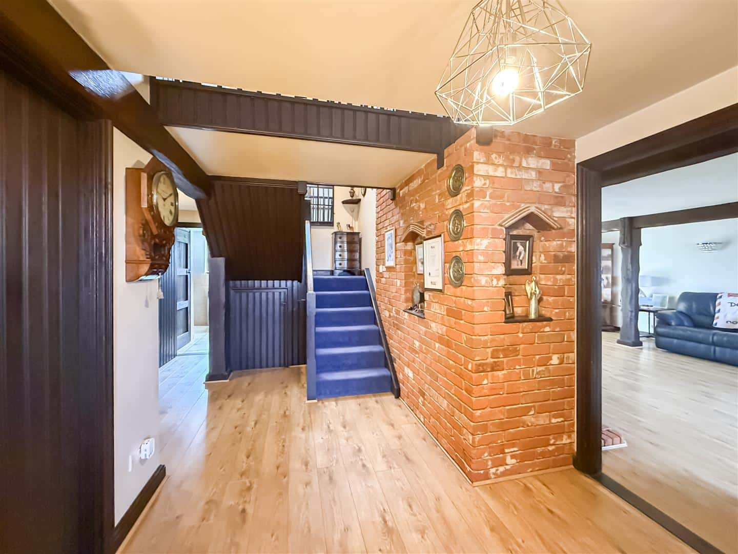 Wooden entrance door with a lead light Queen Anne Rose glazed inset and double glazed side screen windows, to an impressive size hallway. In true Potton style there are exposed ceiling and wall beams and an exposed brick wall with inset shelving, quality wood effect laminate flooring, stairs to the first floor with under cupboard.