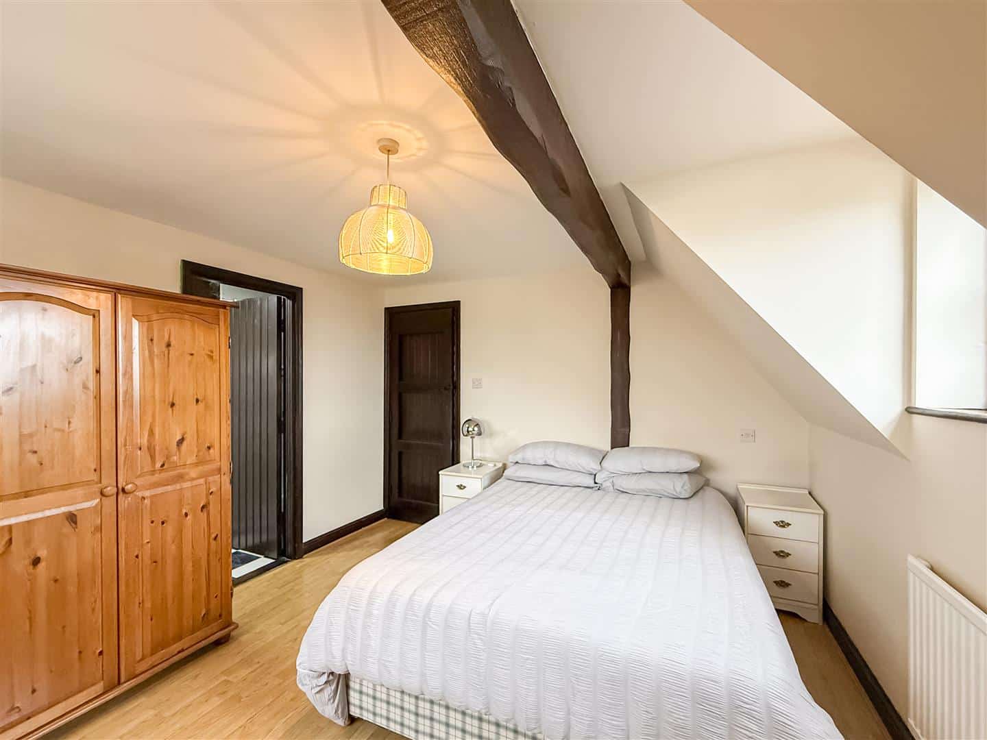 Wood effect laminate flooring, collared exposed beams, radiator and a double glazed window to the side.