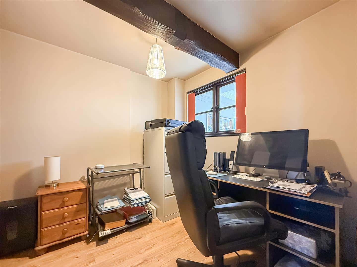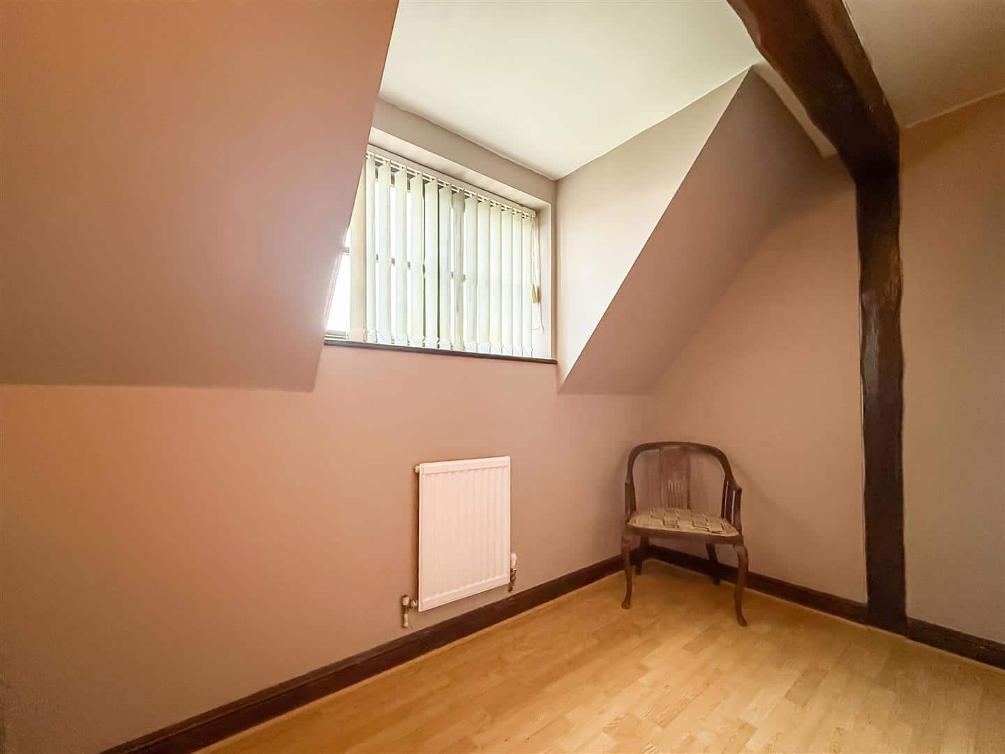 The study is off the lounge and has a continuation of the quality wood effect laminate flooring. Exposed wall and ceilings beams, radiator and a double glazed window to the rear.