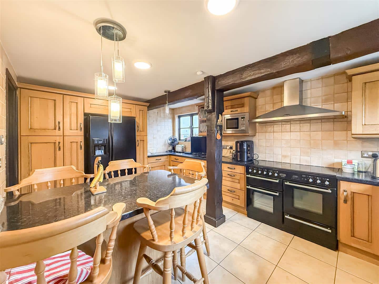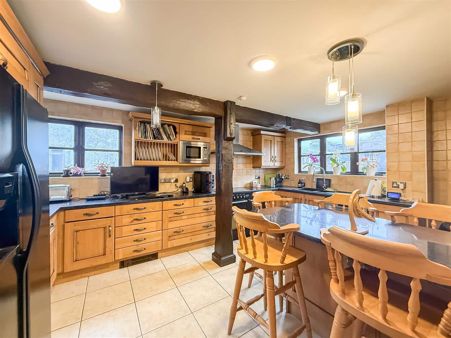 The kitchen has an ample range of solid wooden fronted eye level units with back tiling, matching base units, plate rack and complimentary work surfaces over. One and a half inset sink, space for a range style cooker, with above stainless steel extractor, plumbing for dish washer, space for a fridge/freezer. Large matching breakfast bar with cupboards below, tiled flooring, exposed ceiling and collared beams, tv point and double glazed windows to the rear and side.