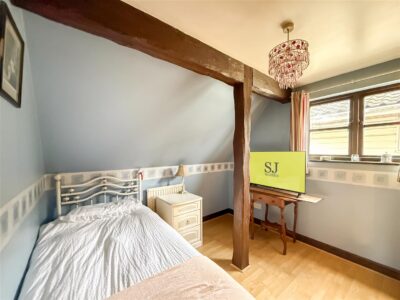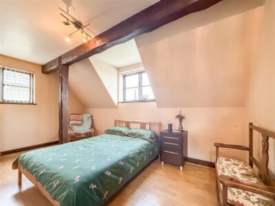 En-suite Free standing ball and claw bath with taps/shower attachment, close coupled w/c, pedestal hand wash basin and walk in shower cubicle. Exposed collared beams, chrome heated towel rail, linen cupboard, double glazed window to the side and a velux style window to the rear.
