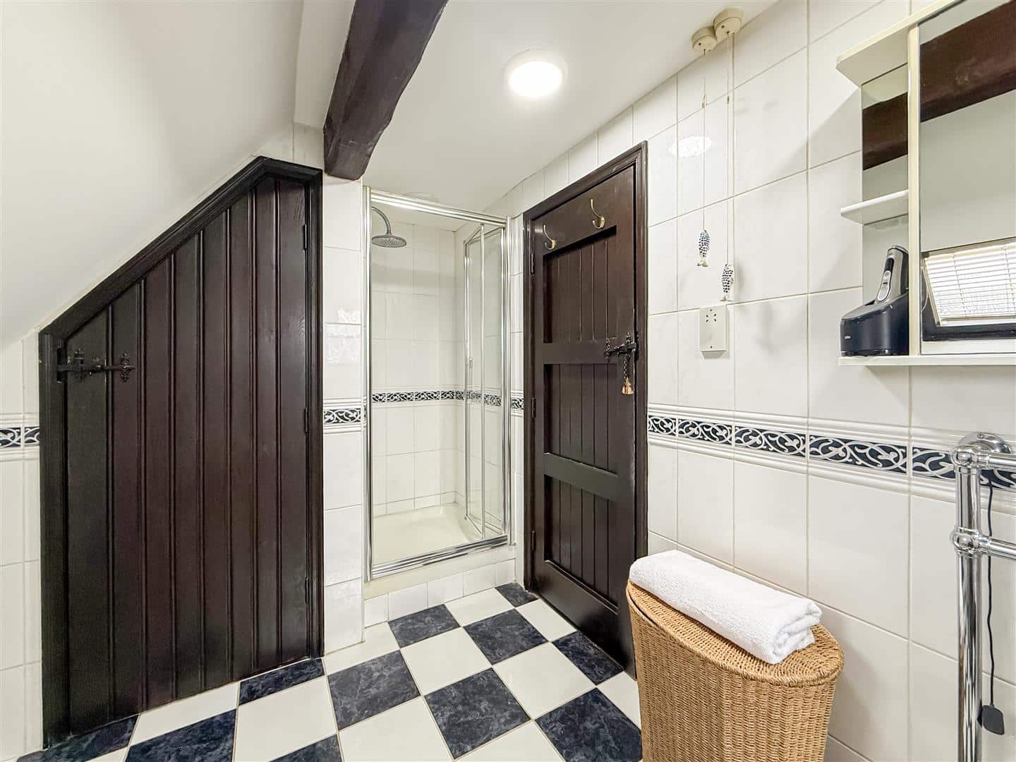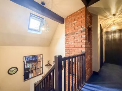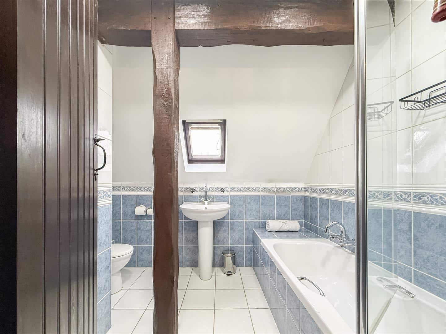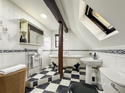 Tiled flooring and walls, panelled bath with above shower and screen, close coupled w/c, pedestal hand wash basin. Exposed collard beams, chrome heated towel rail and a velux style window to the rear.