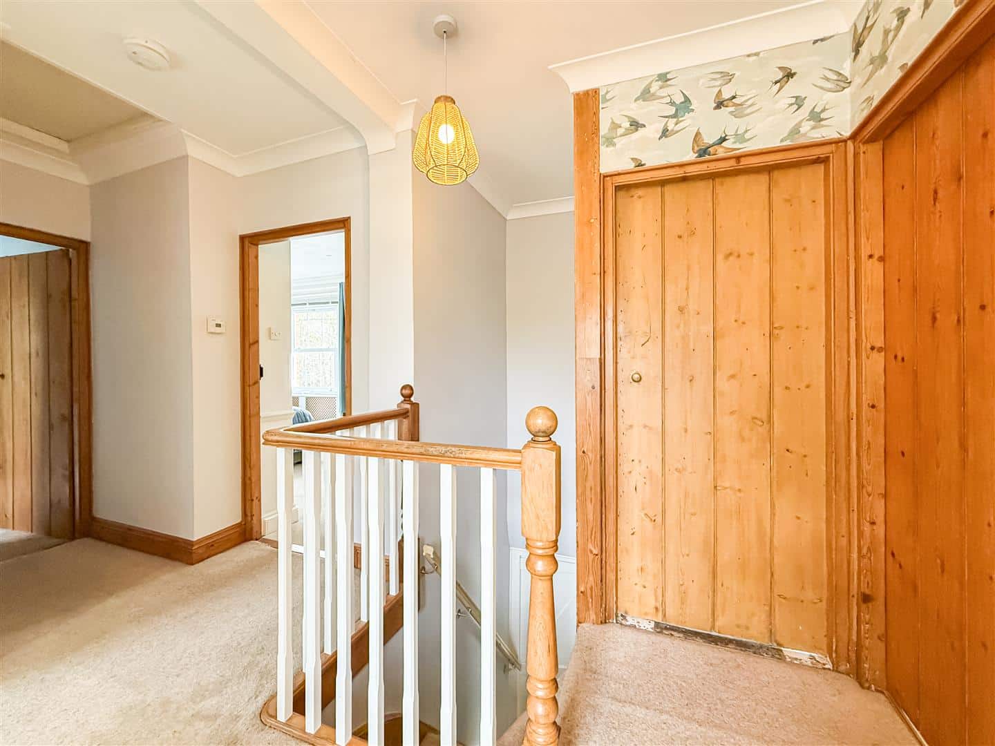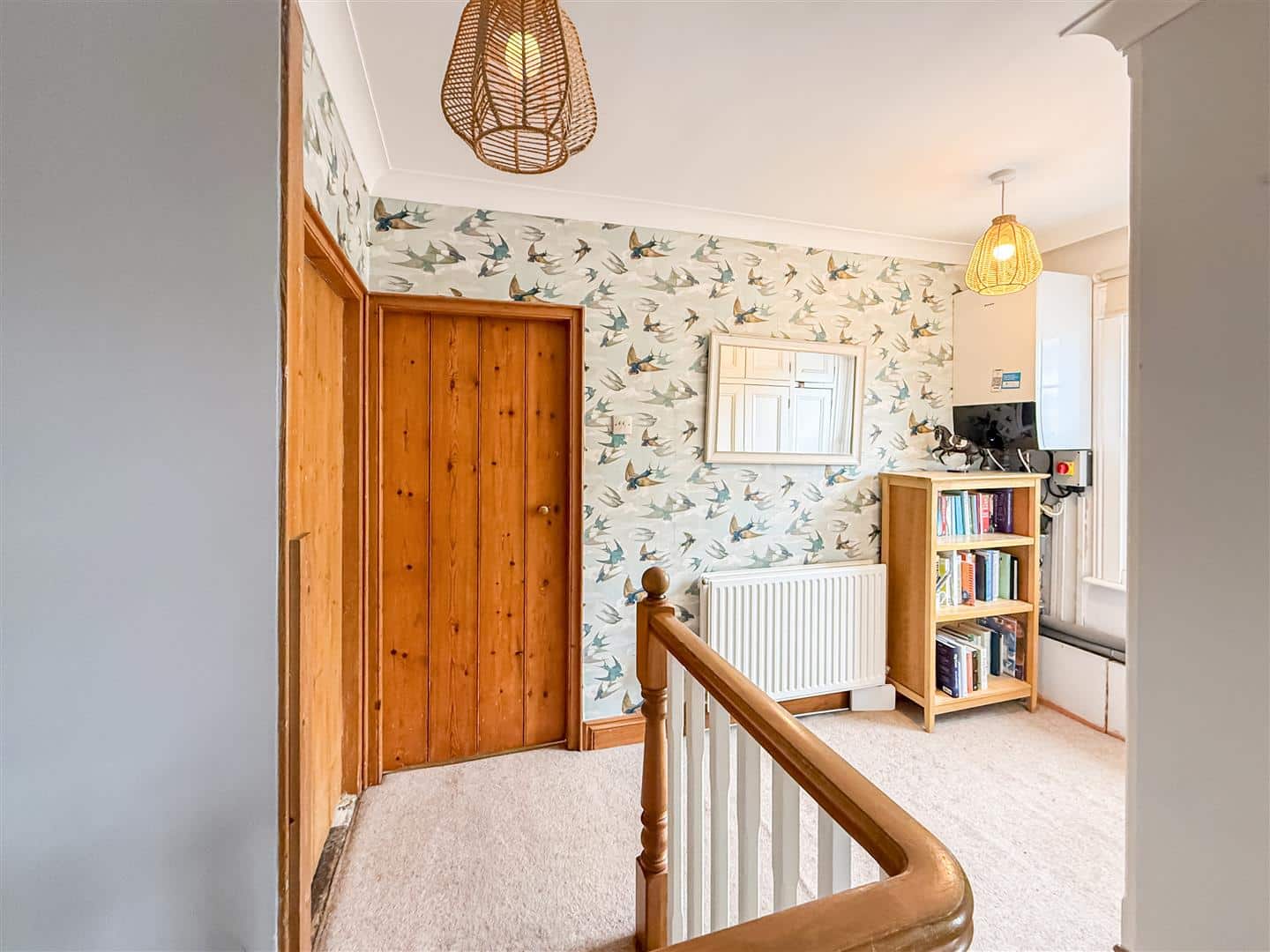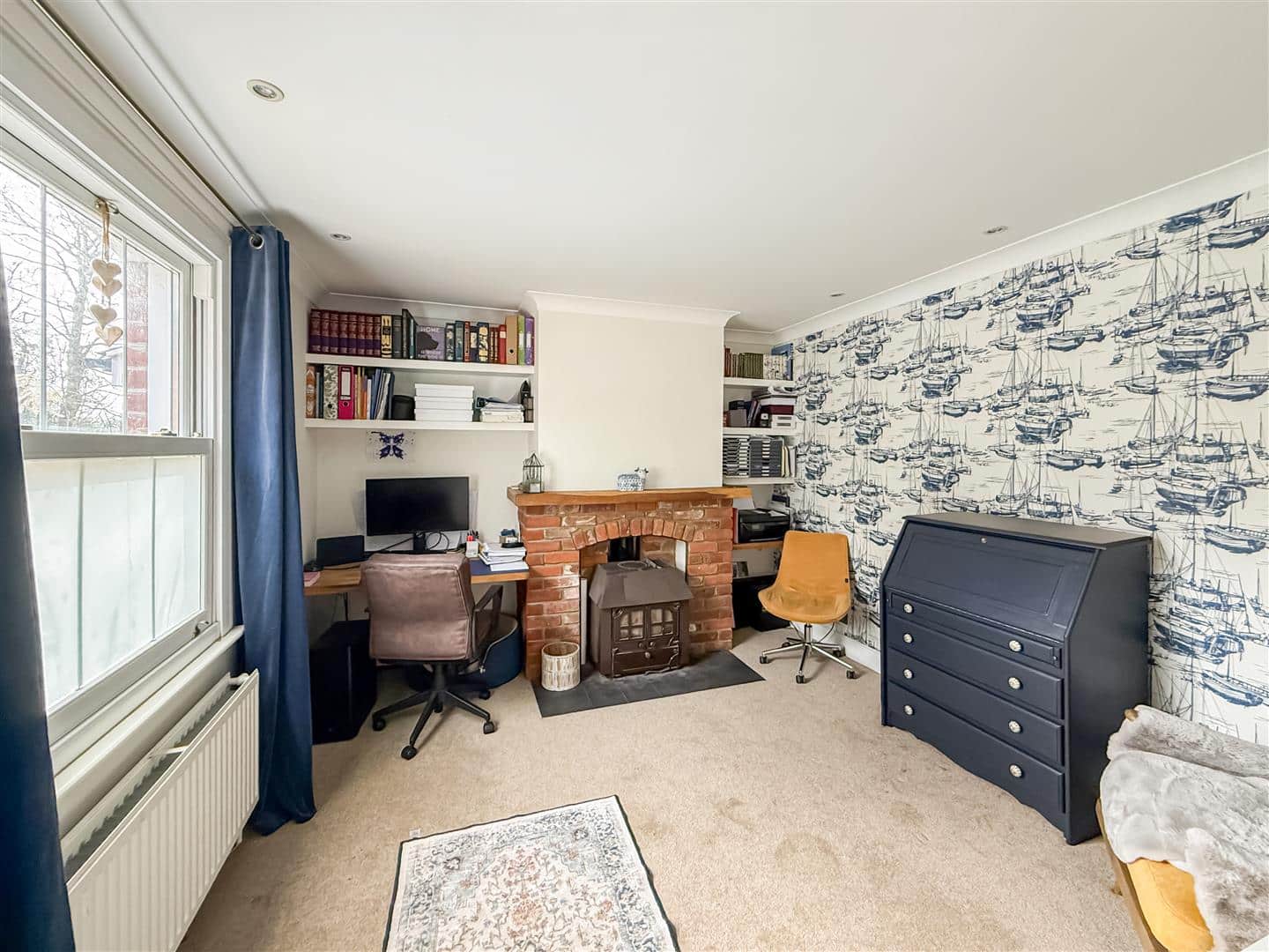 This is a totally versatile room and would make a lovely sitting room or as currently used a home office. There is an open fireplace with wood burner, PLEASE NOTE this would require a new flu and fitting from a professional installer before use. To one side of the fireplace thee is a fitted desk and to the opposite side fitted shelving, down lighting, radiator, a double glazed sash window to the front and door to the staircase.