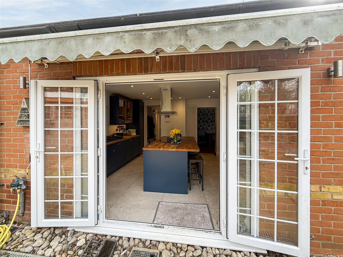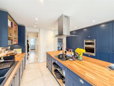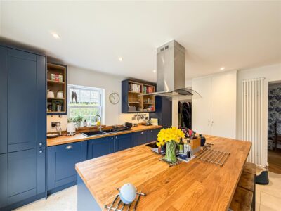 This is a superb room a great hub of the home, with an extensive range of blue modern full length units to one wall incorporating an integrated larder freezer and built in stainless steel double fan oven. The opposite side of the kitchen has matching base units and drawers with solid wooden work tops and an integrated larder fridge, twin bowl sinks and drainer and integrated dish washer. An excellent family size center island/breakfast bar with solid wooden work surface, inset induction hob and stainless steel extractor, pan shelves, drawers and cupboards. Tiled flooring, down lighting, vertical over size white column style radiator. Double glazed sash window to the side and double glazed French doors and side screen windows on to the rear garden.