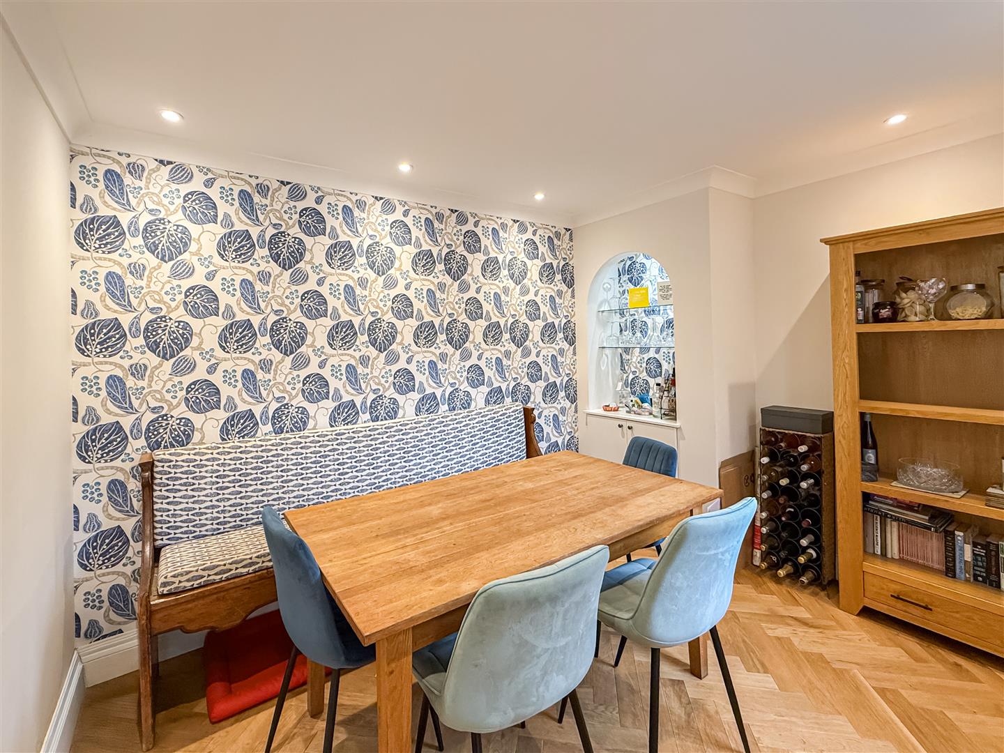 This is a great room for family gathering and has quality fitted Herringbone oak flooring, built in display niece with double cupboards below. Double glazed sash window to the rear, white column style radiator and down lighting.