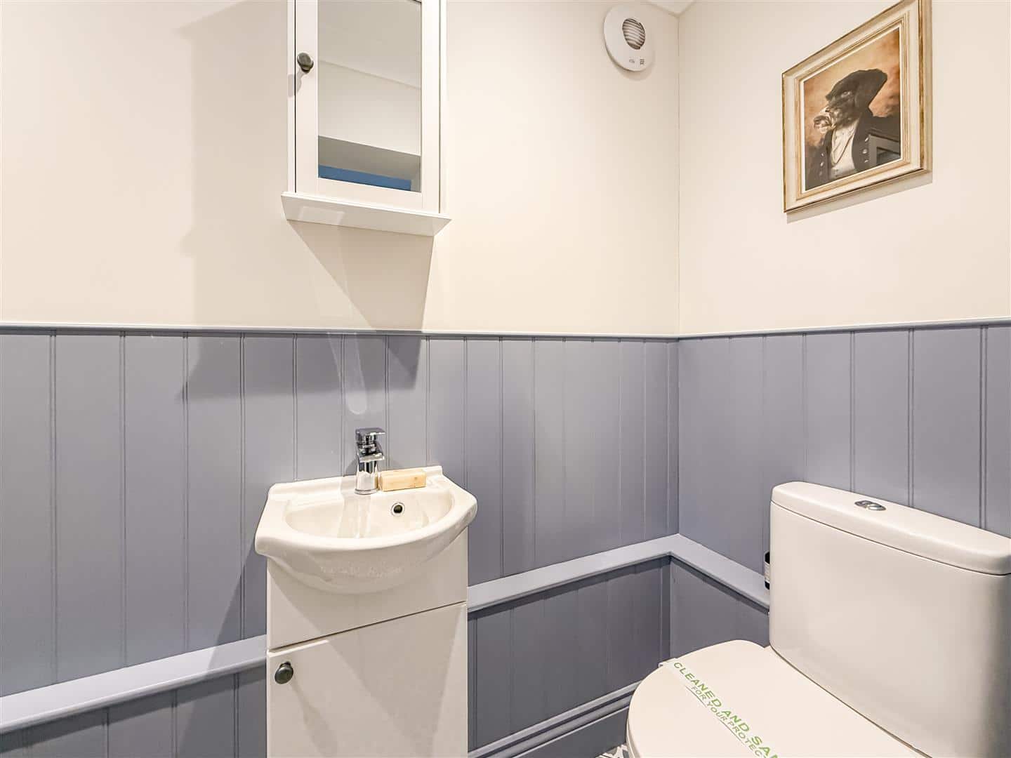 The cloakroom has a continuation of the tiled flooring from the hallway, close coupled w/c, hand wash basin with vanity cupboard below. Part wood panelled walls, down lighting, expel air, white towel rail and a double utility cupboard with plumbing for washing machine and tumble dryer.