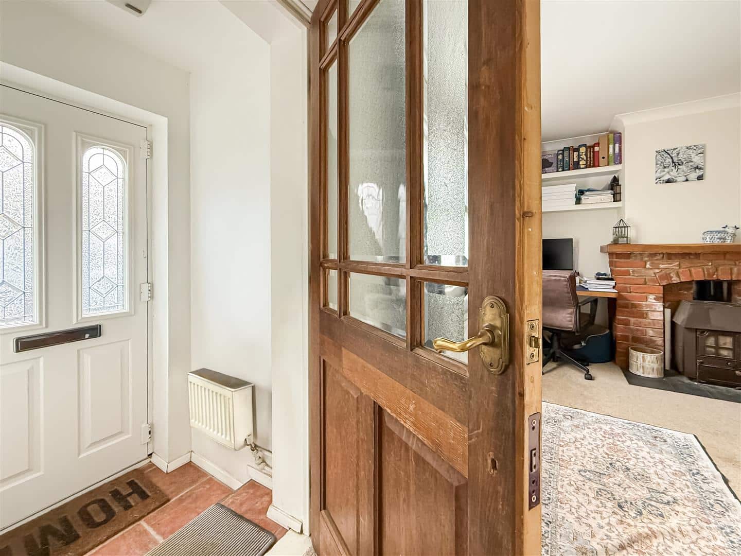 Door to the porch which has tiled flooring and a wooden glazed door to the hallway.