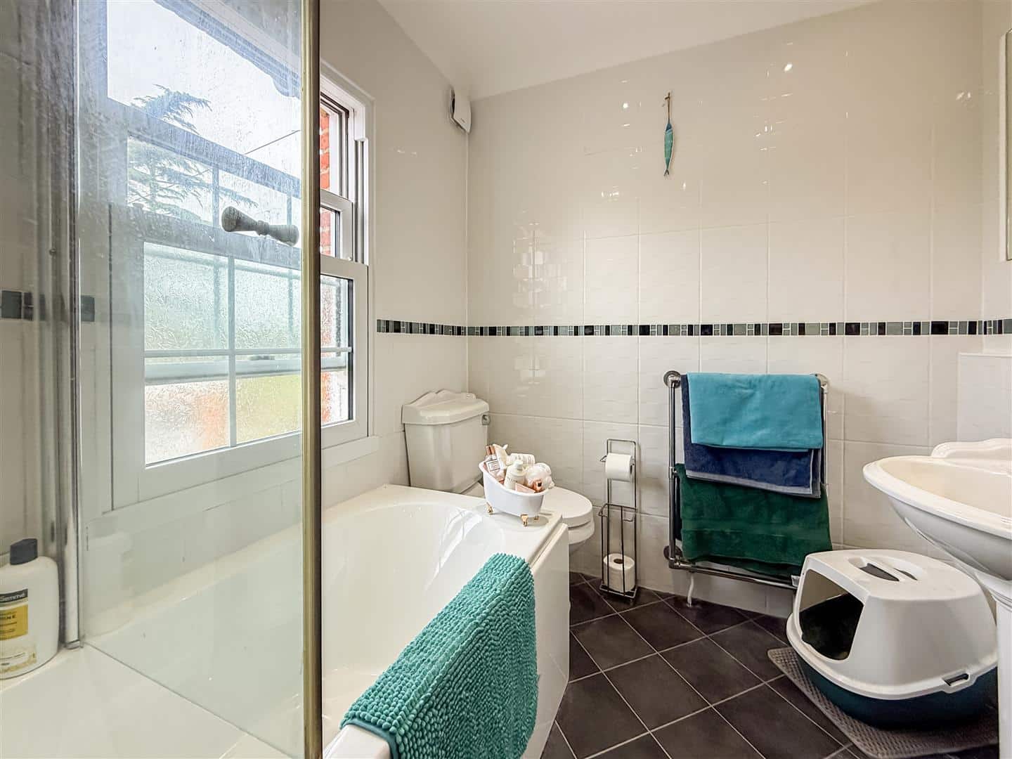Panelled bath with above fitted shower and screen, close coupled w/c, pedestal hand wash basin. Down lighting, tiled walls, expel air, chrome heated towel rail and a double glazed sash window to the rear.