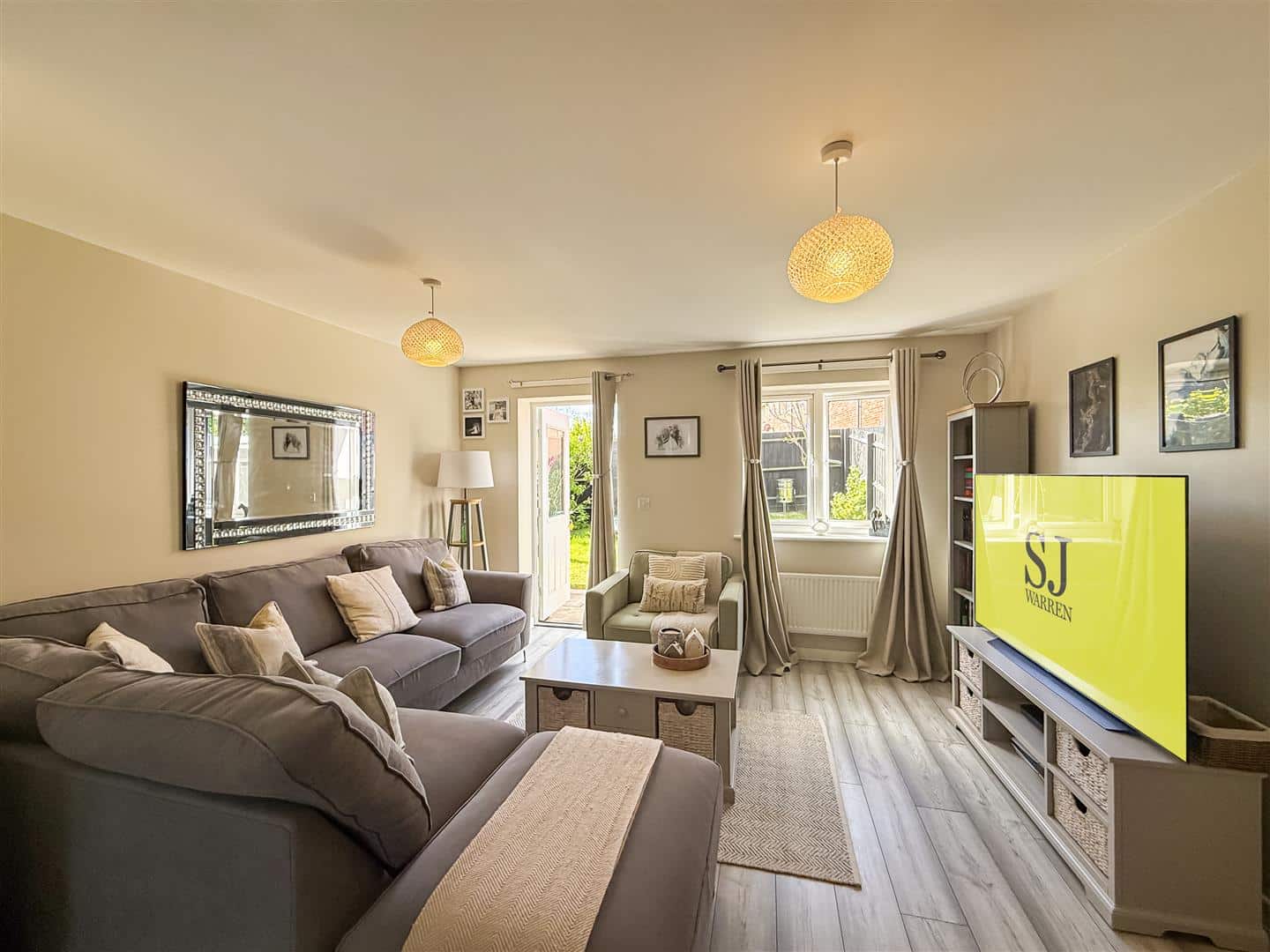 A spacious room backing the South facing garden, wood effect grey laminate flooring continuing from the hallway. Television point, large understairs storage cupboard, two radiators and a double glazed window and door to the rear.