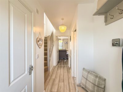 Double glazed entrance door to the hallway which has grey wood effect laminate flooring. Wall mounted Hive control for the heating, radiator and stairs to the first floor landing.
