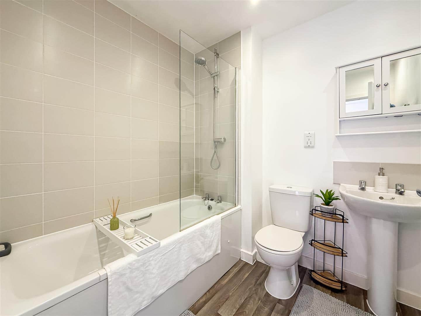 Part tiled walls, down lighting, panelled bath with fitted shower and screen, close coupled w/c and a pedestal hand wash basin. Chrome heated towel rail, shaver point and expel air.