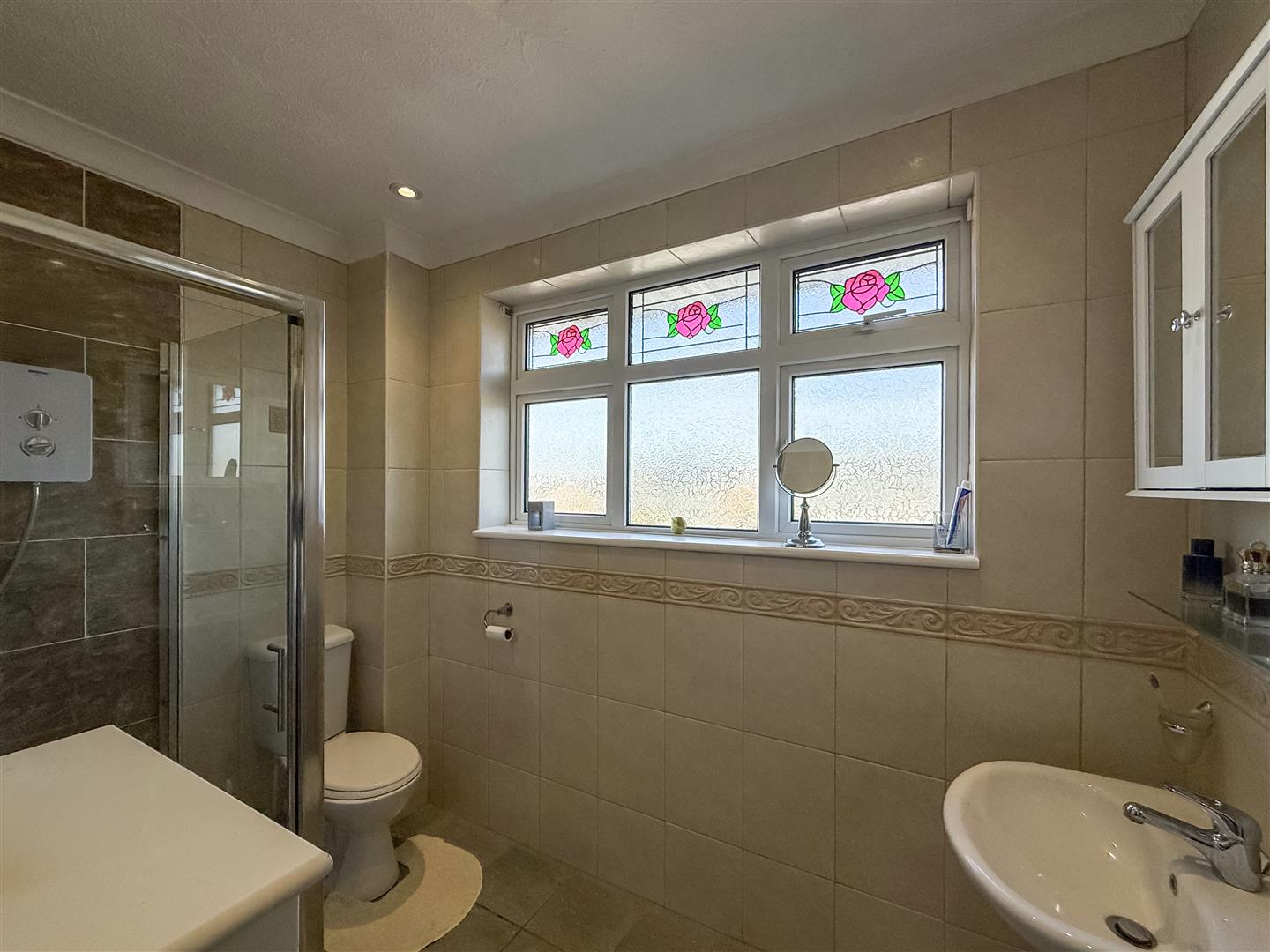 Tiled walls and flooring, over size walk in shower cubicle, close coupled w/c, pedestal hand wash basin. Down lighting, white heated towel rail and a double glazed window to the front.