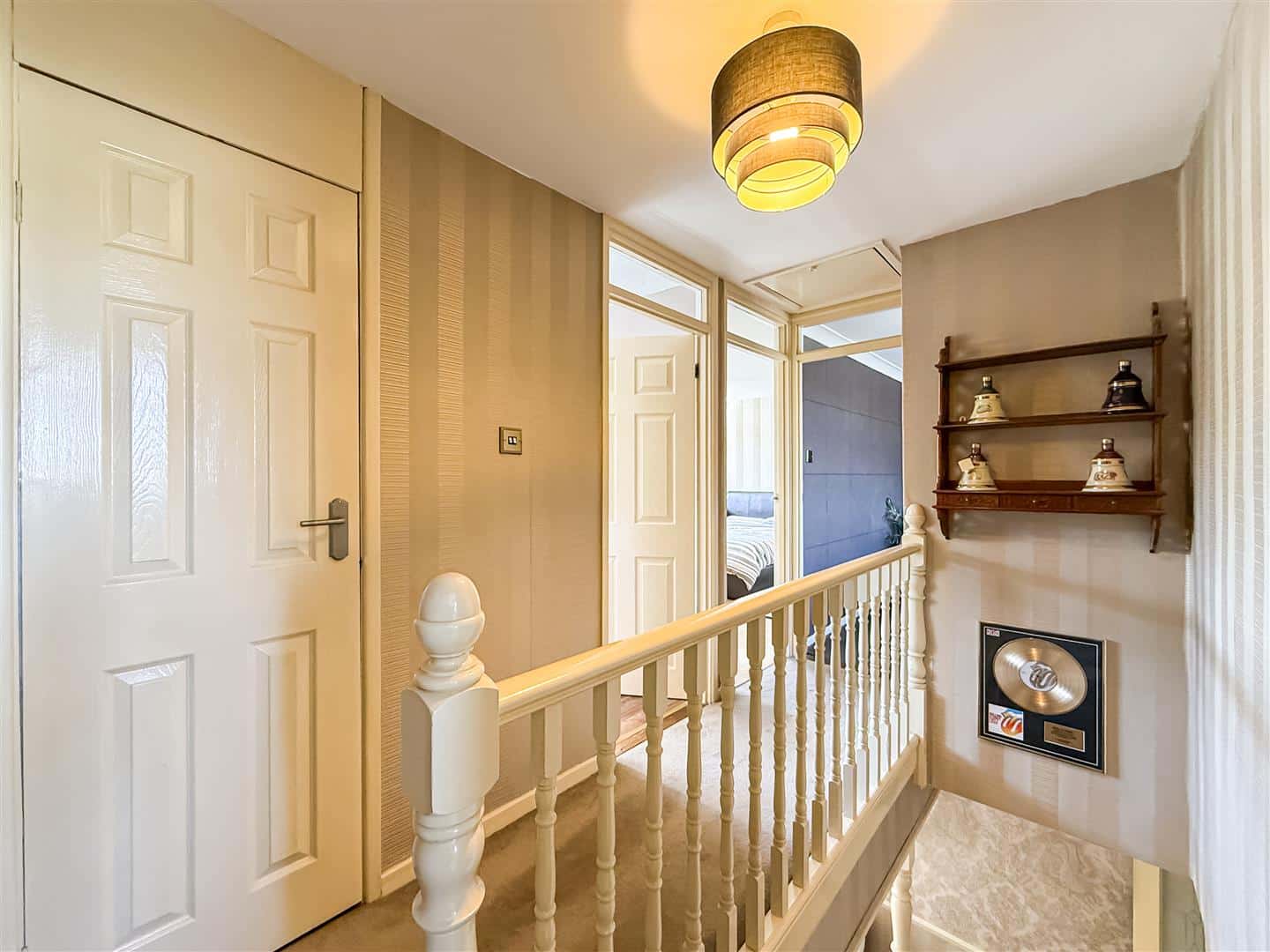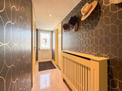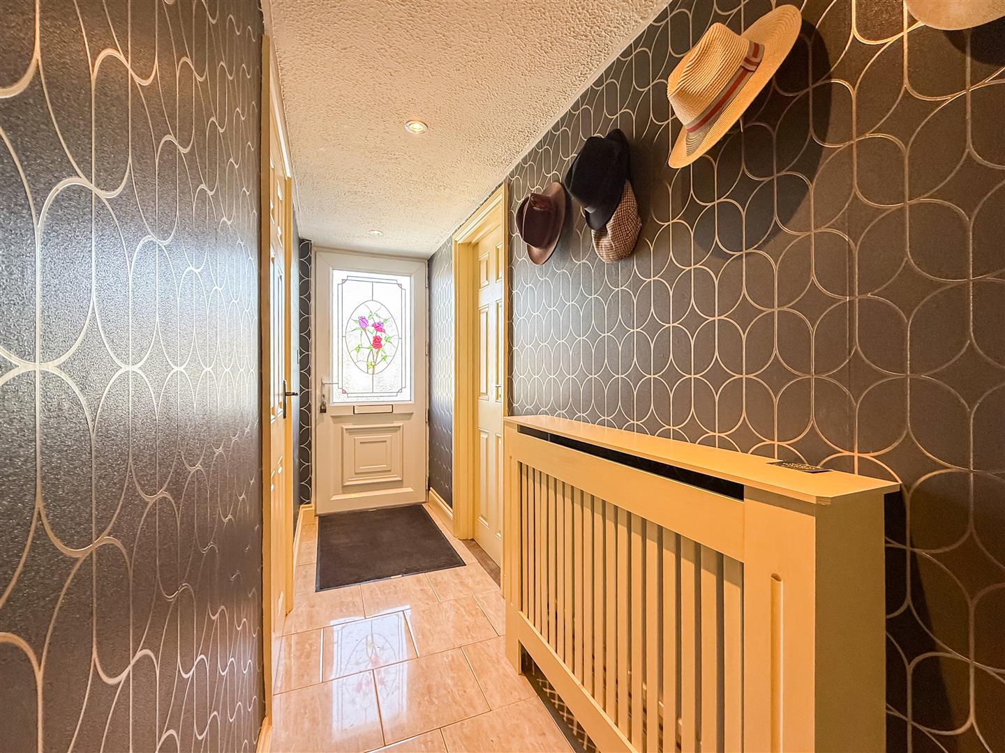 Double glazed entrance door with stained glass motif to the hallway. Wood Tiled flooring, radiator with decorative cover, down lighting and internal door to the garage.