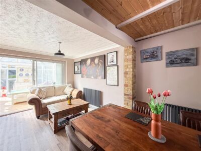 Wood effect laminate flooring runs through these three rooms and Dining Room offers plenty of space for a family table and chairs. One wall again is brick slip tiled and there is a column style radiator and television point.