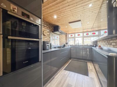 The kitchen is open plan to the dining room and sitting room and this modern style living works particularly well. The kitchen is fitted with a modern range of grey high gloss eye level units with brick slip back tiling, matching base units and drawers with quality composite work surfaces over and an integral dish washer. Inset gas five ring hob with above extractor and glass splash back, built in stainless steel Bosch fan oven, inset one and a half sink, space for American style fridge/freezer, down lighting and a double glazed window to the front.