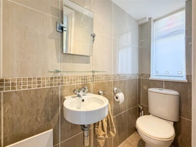 Tiled flooring, close coupled w/c, hand wash basin and a cloaks area for coats etc. Down lighting, expel air, wall mounted electric panel heater and a double glazed window to the front.