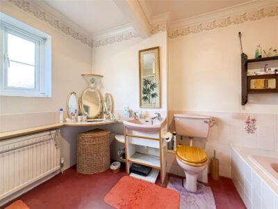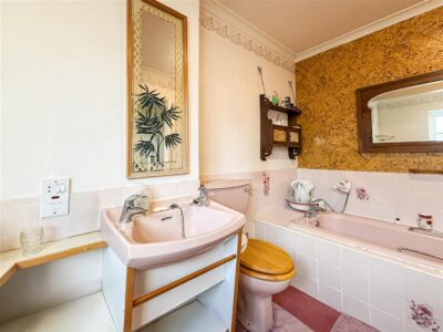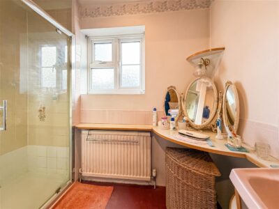 This is larger due to the small two storey extension with a panelled bath taps/shower attachment, close coupled w/c, hand wash basin, walk in shower cubicle, shaver point, radiator and a double glazed window to the rear.