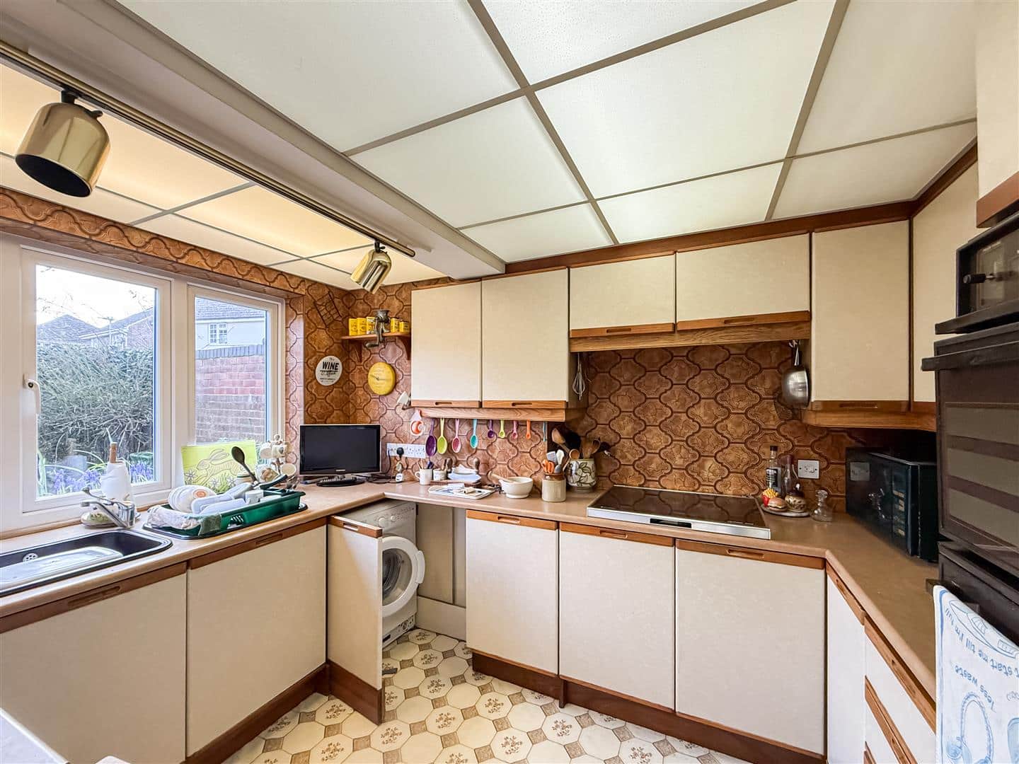 The small extension that was added has increased both the kitchen and the above family bathroom. There is a range of leather effect fronted wood trim eye level units with back tiling, matching base units and drawers with work tops over. Inset sink, inset gas hob and a built in oven, space for a fridge/freezer and plumbing for a washing machine, suspended ceiling, built in larder/cupboard and a double glazed window and door to the rear.