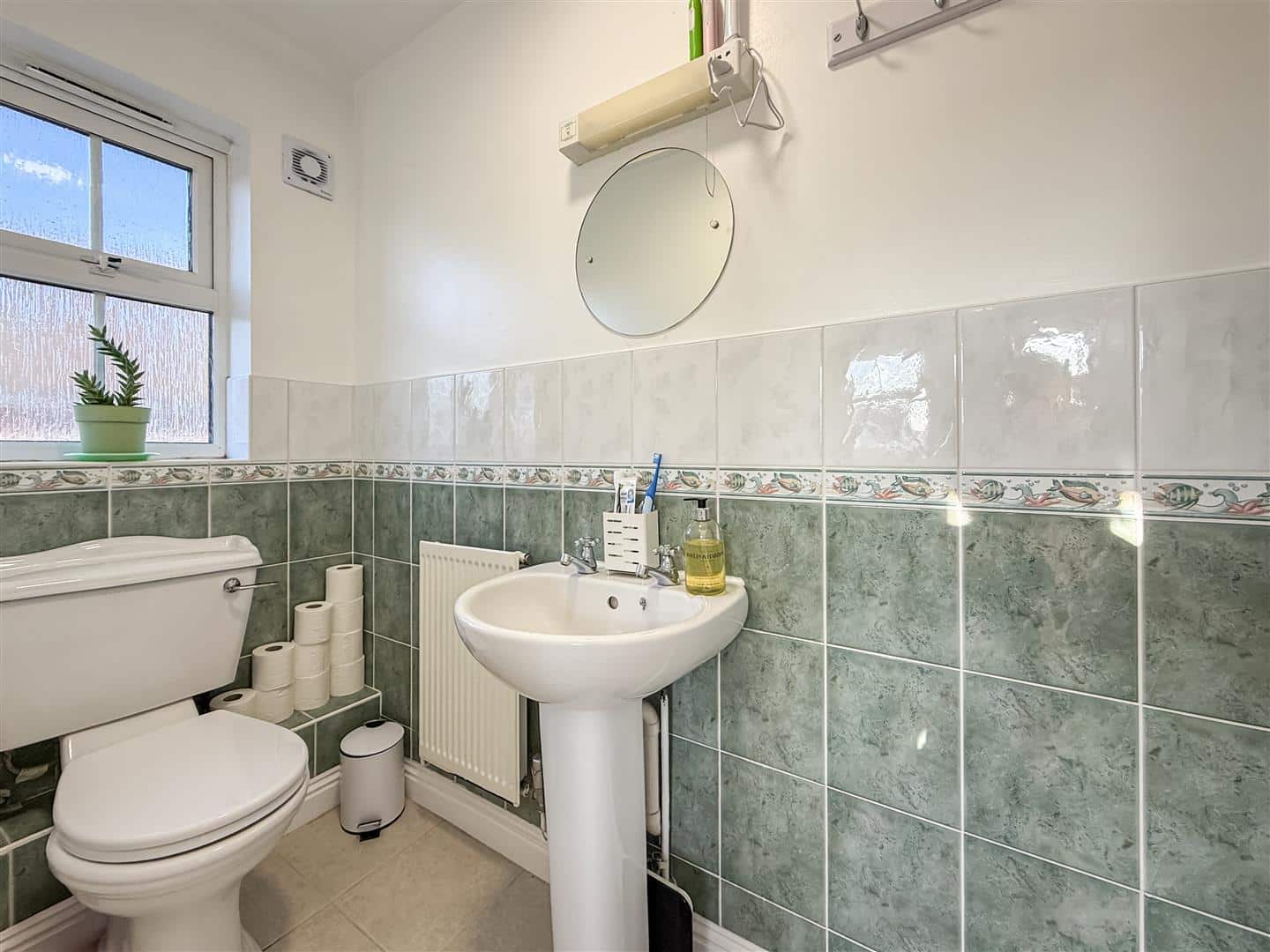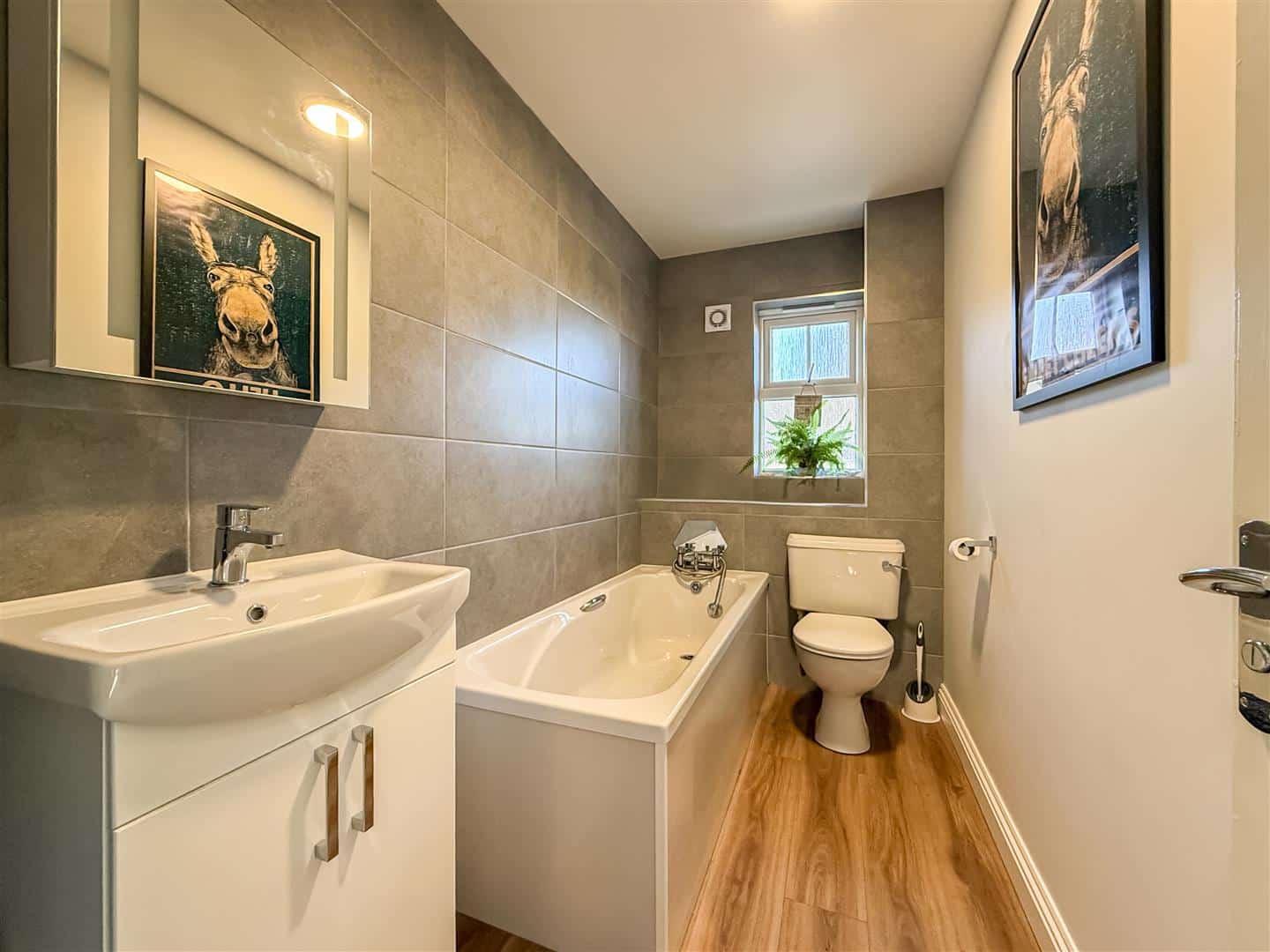 Wood effect laminate flooring, panelled bath with taps/shower attachment, close coupled w/c, hand wash basin with vanity cupboards below. Part tiled walls, chrome heated towel rail, expel air and double glazed window to the side.