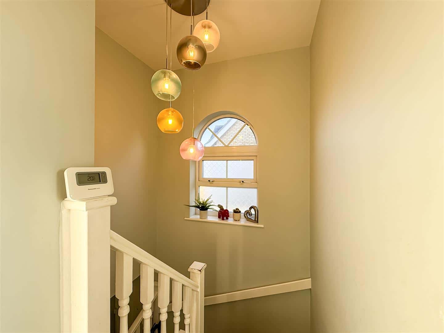 Cathedral style double glazed window to the side, linen cupboard part shelved with pressurised water tank, loft access and radiator.