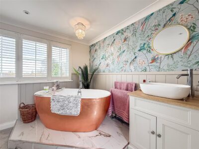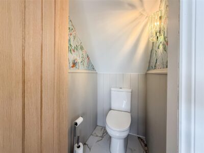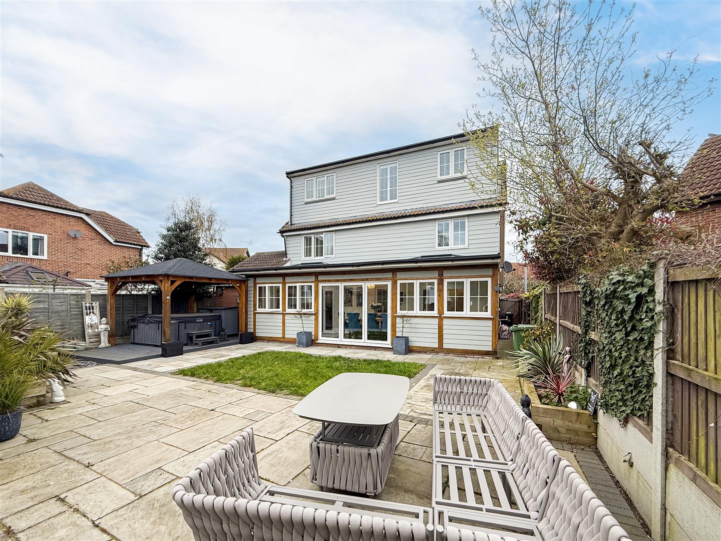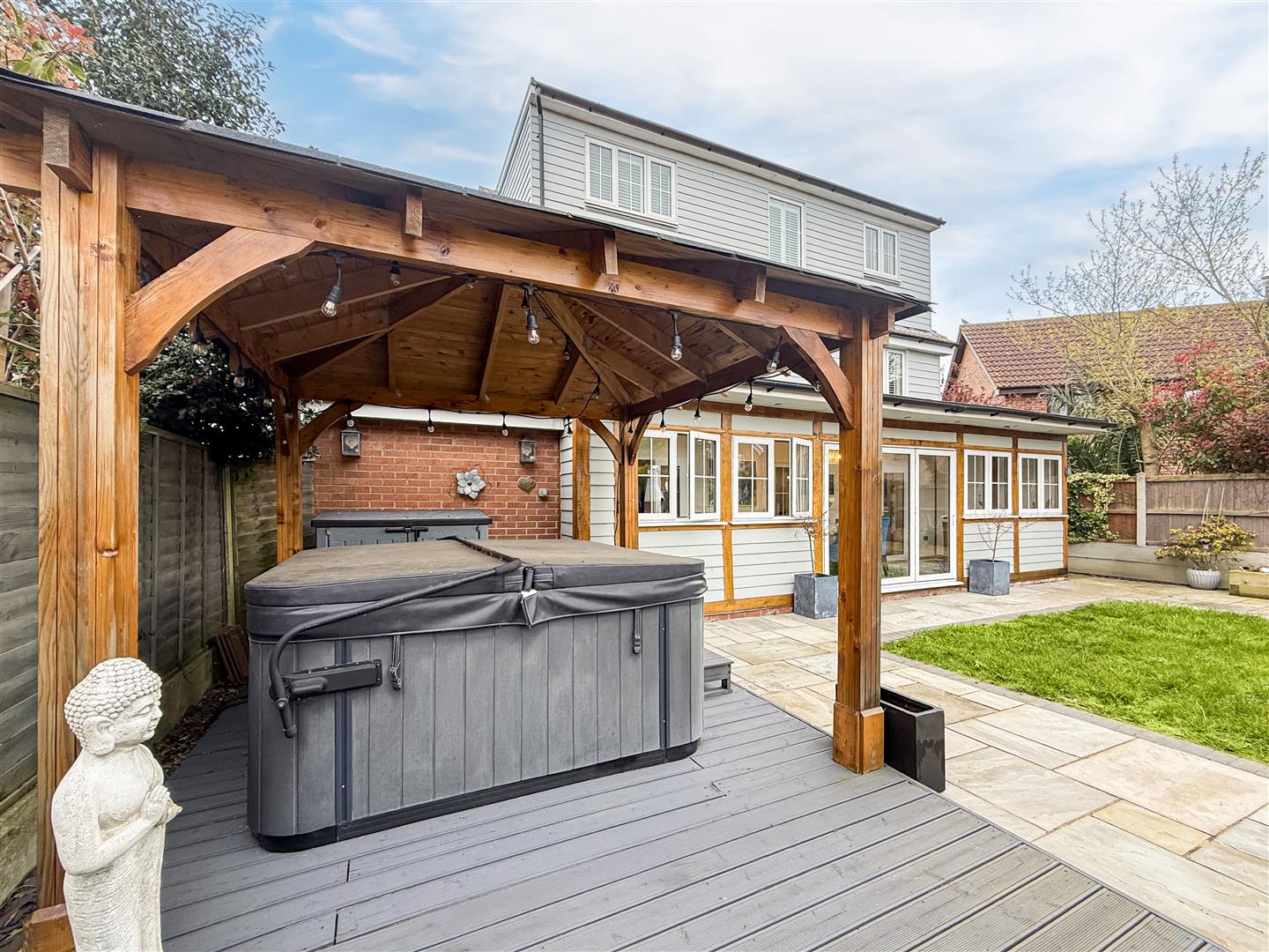 The rear garden is a well proportioned space and if you enjoy the summer sun, even better being South facing. Neatly laid lawn and large patio area ideal for entertaining along with the rear raised decking area, in addition to the side of the garden is a covered roof pergola with space for a hot tub and additional power sockets.