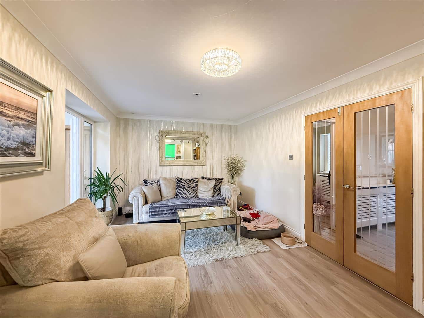 Wood effect flooring and an entertainment wall for your television and sound system incorporating a quality glass fronted fitted log flame effect electric fire. Two sets of double glazed French doors and side screen windows to the rear and radiator with decorative cover.
