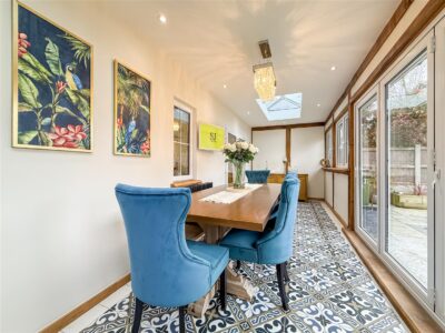 This once again is an excellent size room which can be used all year around, great for part dining room or for entertaining. Double glazed windows and bifolding doors open on to the South facing rear garden, tiled flooring, column style radiator, two roof lanterns and courtesy door to the garage.