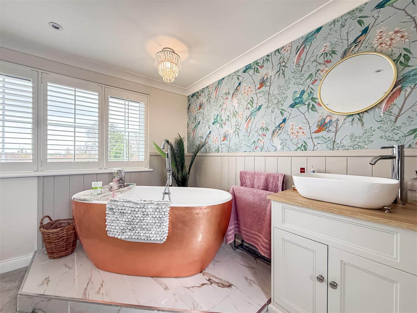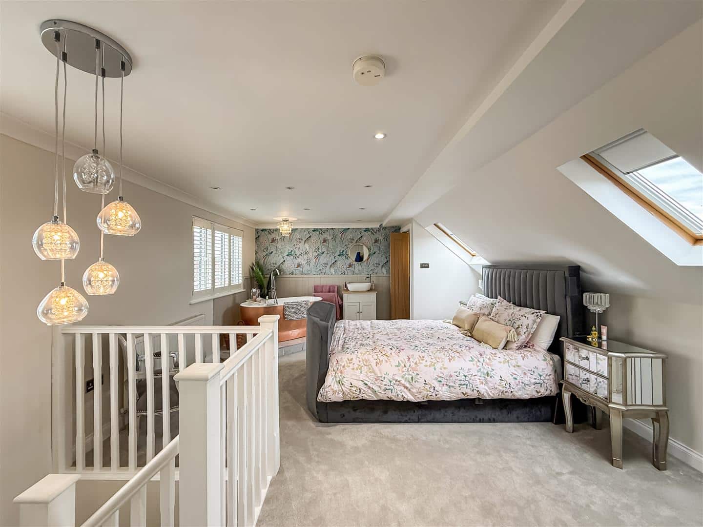 The bedroom area has two velux style windows to the front and a double glazed window to the rear with fitted white/shutter blind, open tiled surround with a copper external colour white free standing bath with chrome stand taps and shower attachment, free standing hand wash basin with double vanity cupboards below. Door to a close coupled w/c with tiled flooring.