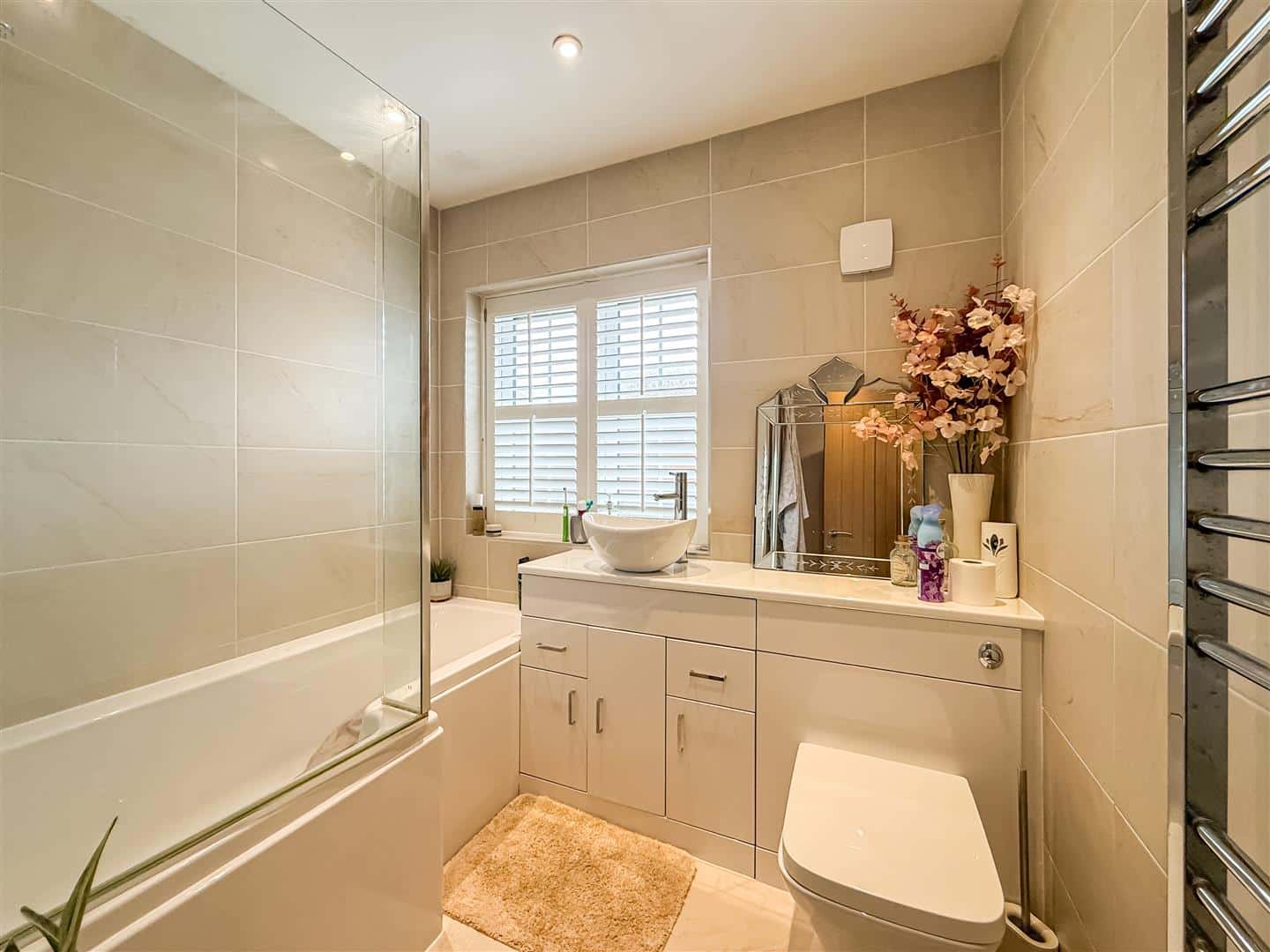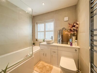 Tiled walls and flooring, Linen cupboard housing the hot water cylinder down lighting and a suite comprising of a panelled bath with taps and dual function shower over, vanity surround incorporating w/c with concealed cistern and free standing wash basin. Double glazed window to the front and a heated chrome towel rail.
