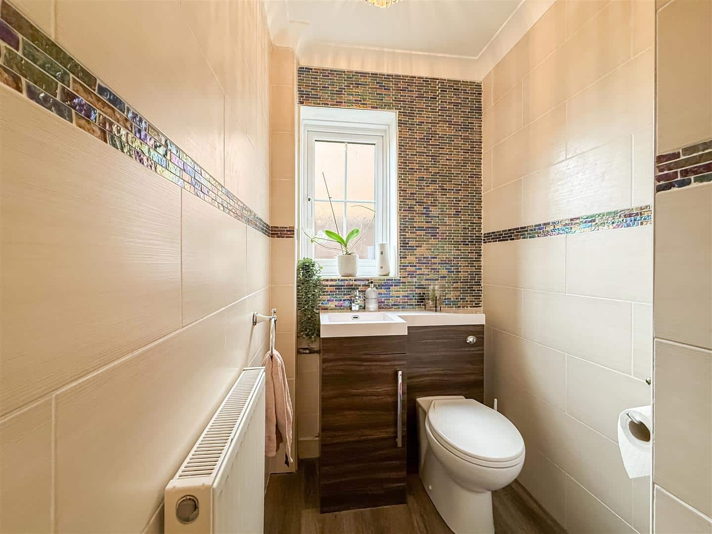 A white suite comprising of a built in w/c and concealed cistern, incorporating the hand wash basin with vanity surround and cupboards below. Wood effect laminate flooring, tiled walls , radiator and a double glazed window to the side.